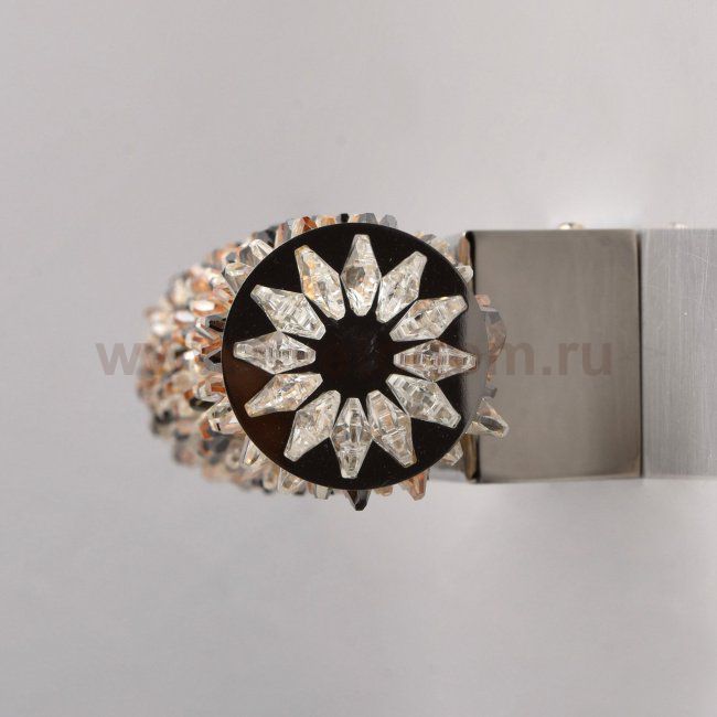Корпус светильника выполнен из нержавеющей стали. Светильник декорирован хрусталем формы октагон и бусина. Хрусталь трех цветов: прозрачный, янтарный и дымчатый. Светодиодные источники света типа SMD stripe. Комментарий