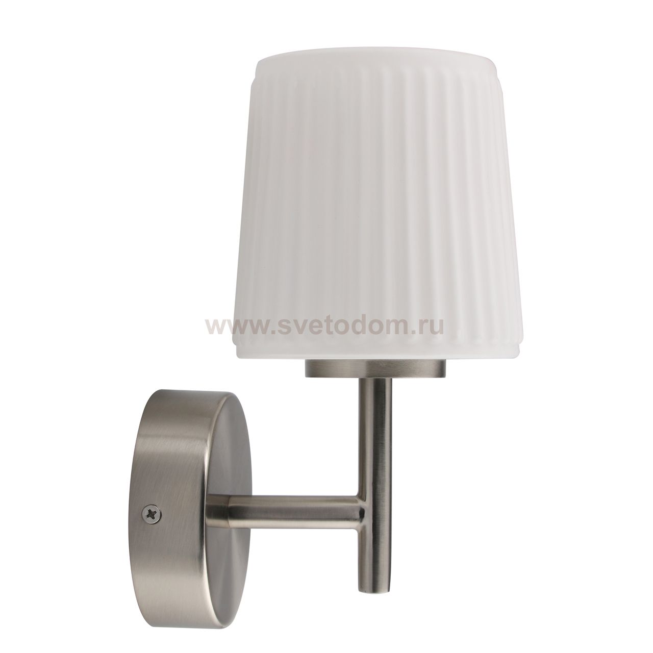 Основание светильника выполнено из металла и гальванизировано в цвет хрома. Стеклянный плафон отлит в сложную гофрированную форму, матирован и окрашен изнутри в белый цвет. Комментарий