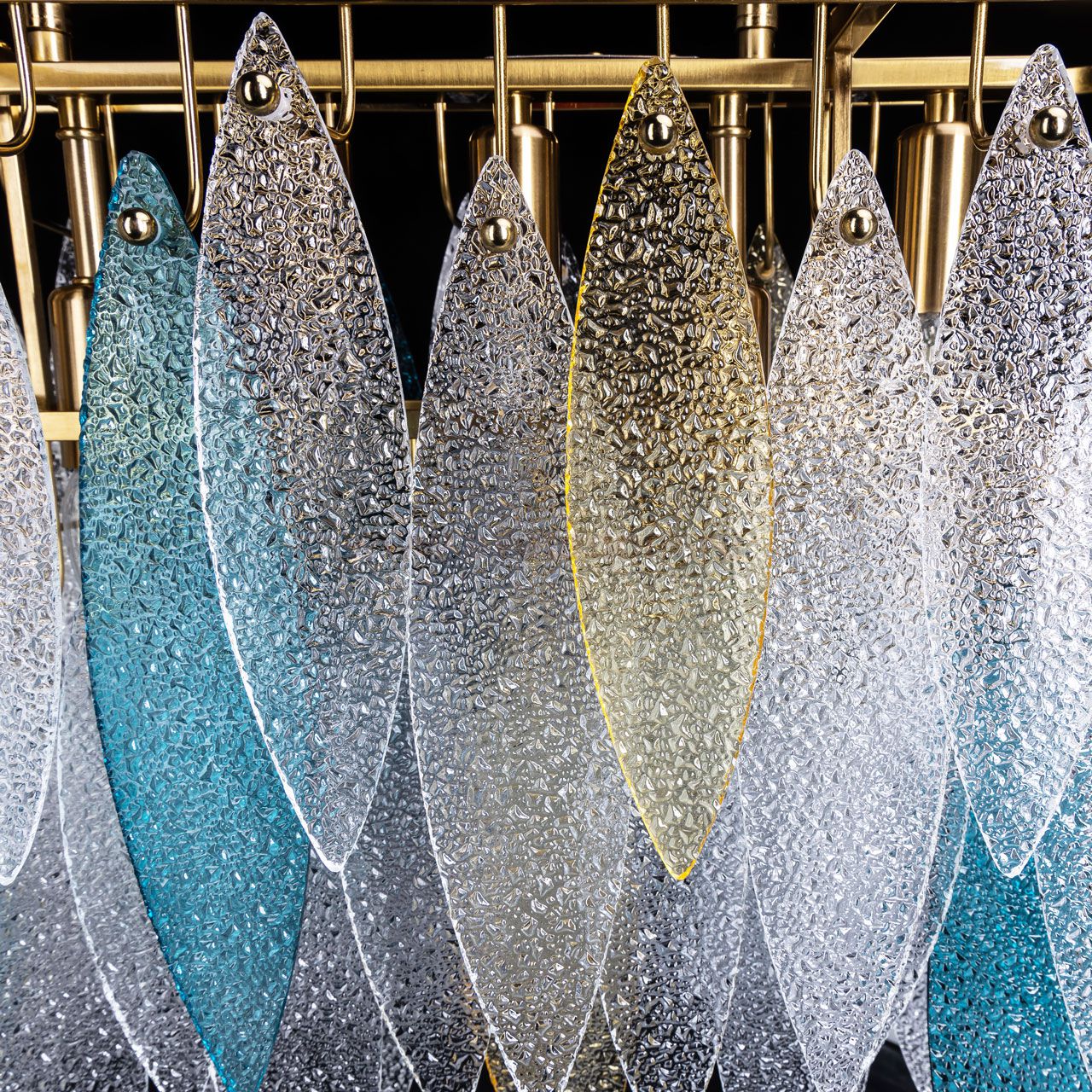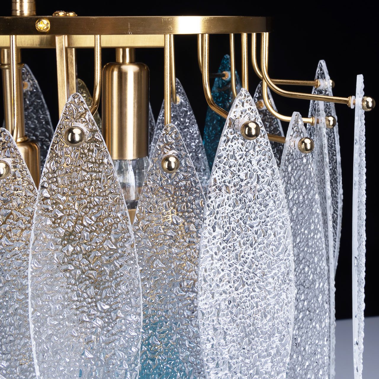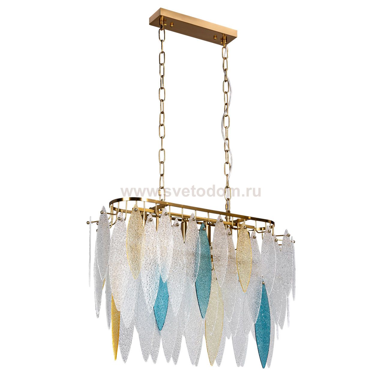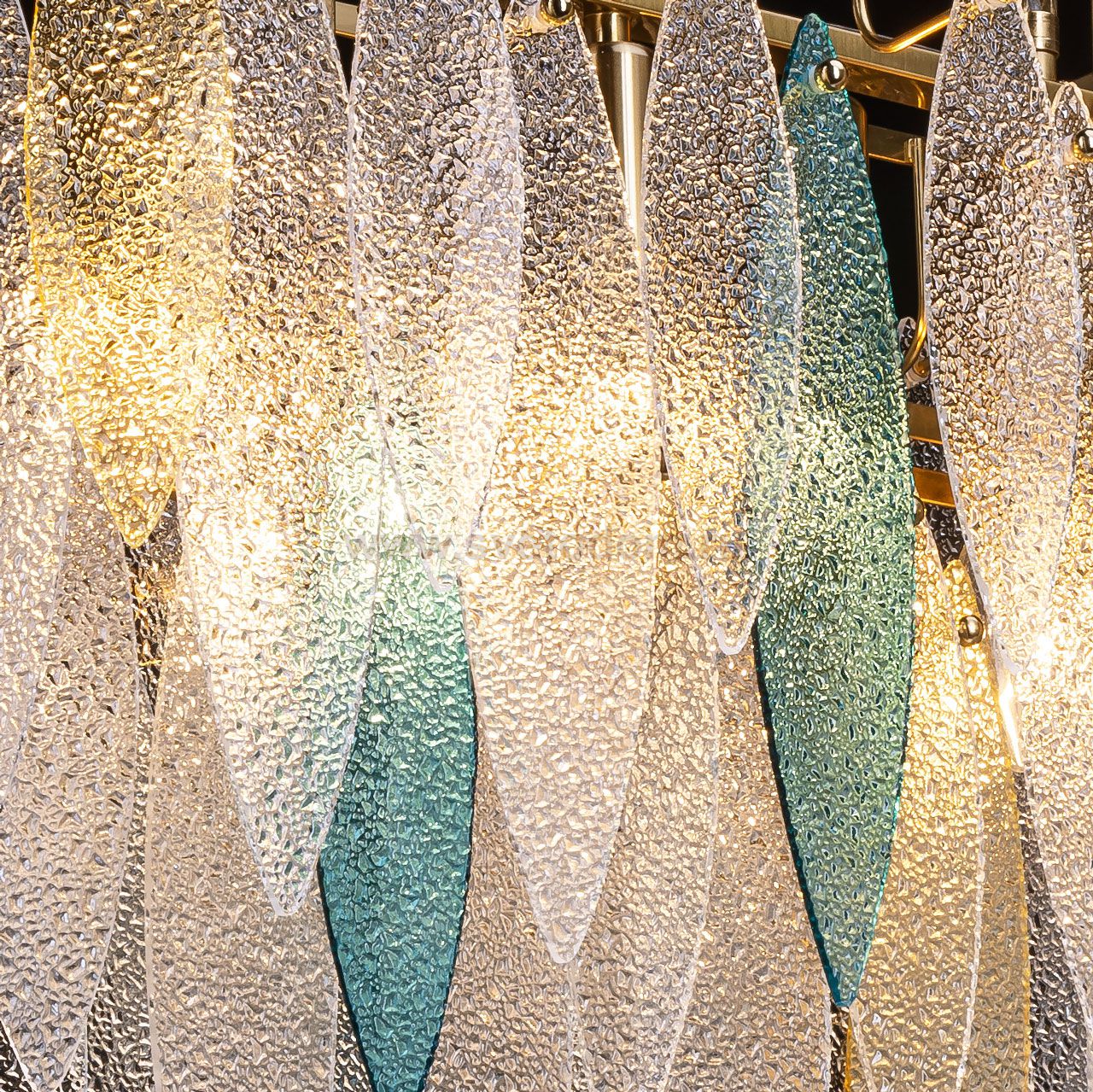 Металлическое основание подвесного светильника гальванизировано в цвет латуни. Люстра декорирована фактурными стеклянными пластинами прозрачными, голубого цвета и цвета шампань. Комментарий