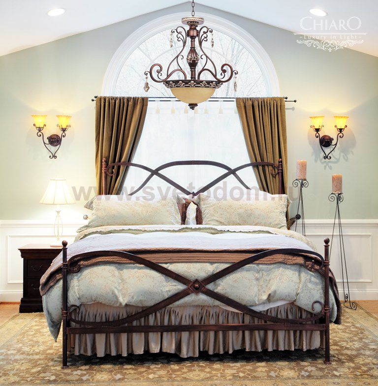 Дизайн – в идее создания коллекции лежит цветок лилии. Рисунок арматуры изящно повторяет плавные изгибы лепестков. Необычное исполнение плафонов светильника – матовый плафон искусственно состарен и отлично дополняет «легкий» образ кованого светильника. Мягкое распределение светового потока.