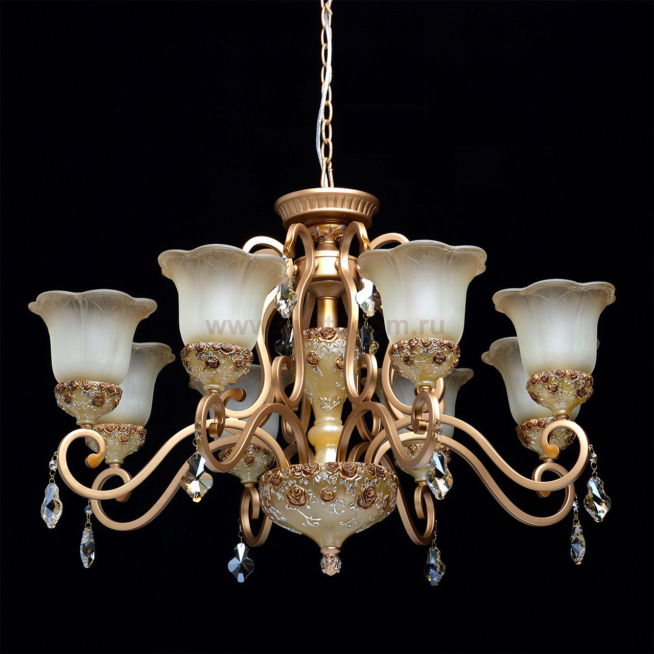 Кованная арматура из сплава железа, окрашена вручную плотным, равномерным слоем. Декоративные элементы из полупрозрачного искусственного каучука (полирейзена) отлитого в форму с последующим двухслойным, двухцветным окрашиванием. Плафоны с волнообразным краем отлитые в форму.. Подвесы из гальванизированного хрусталя цвета «шампань», в тон арматуры, хрусталь ТМ F&D Crystal. Комментарий