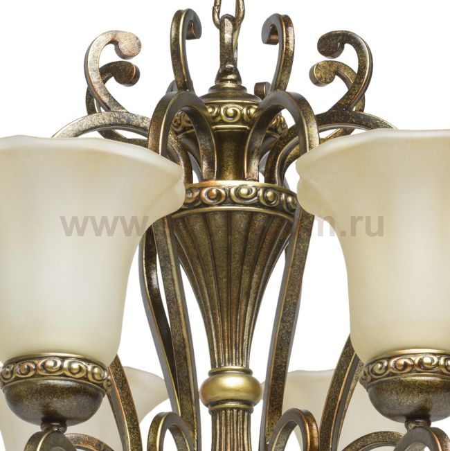 Светильник в стиле традиционной ковки. Арматура из сплава железа. Двухслойное окрашивание: первый равномерный, выполняет защитную функцию, второй уникальный - техника мазка губкой. Декор из искусственного каучука аналогично окрашен. Плафоны, отлитые в форму с волнообразным краем, из стекла с алебастровой крошкой, с последующим матированием. Комментарий