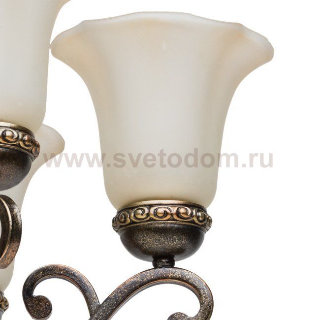 Светильник в стиле традиционной ковки. Арматура из сплава железа. Двухслойное окрашивание: первый равномерный, выполняет защитную функцию, второй уникальный - техника мазка губкой. Декор из искусственного каучука аналогично окрашен. Плафоны, отлитые в форму с волнообразным краем, из стекла с алебастровой крошкой, с последующим матированием. Комментарий