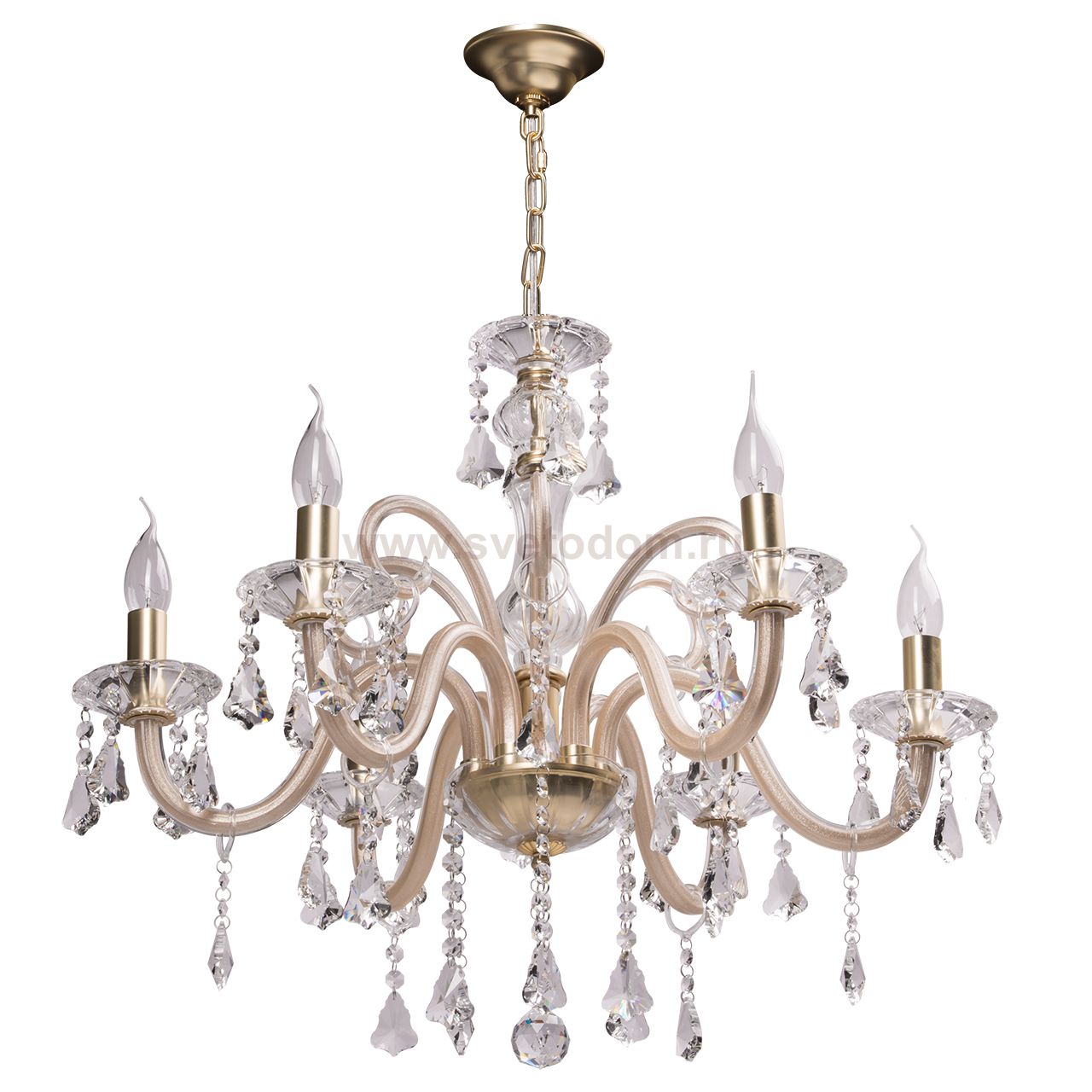 Описание модели 624010206: Хрустальное очарование подвесного светильника Илвита из коллекции Crystal в изящных деталях. Люстра украсит зал или просторную гостиную и станет значимым акцентом интерьеров в стилях Классицизм, Барокко или Рококо. Металлическая арматура цвета золота роскошно украшена стеклянными выдувными элементами, окрашенными изнутри перламутровой золотой пылью, которые изящными завитками перекликаются между собой. Звонкие подвески из радужного хрусталя добавляют образу светильника Илвита искристые солнечные блики. Декоративные лампочки накаливания, имитирующие изящные свечи с хрустальными розетками освещают пространство до 24 кв.м