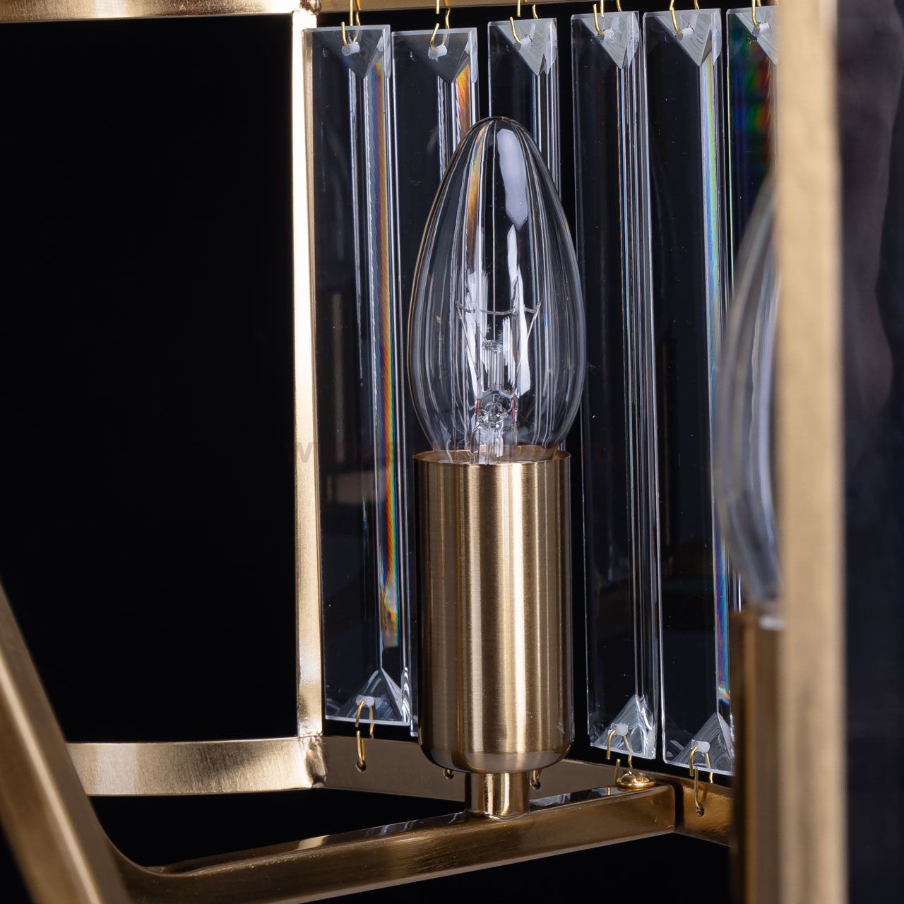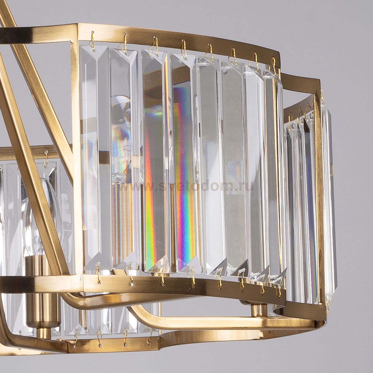 Металлическое основание потолочной люстры гальванизировано в цвет бронзы. Люстра декорирована прозрачным хрусталем прямоугольной формы. Комментарий
