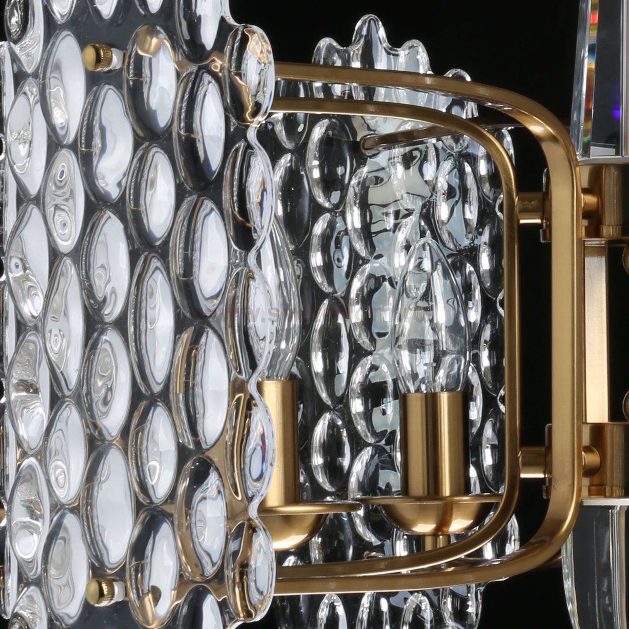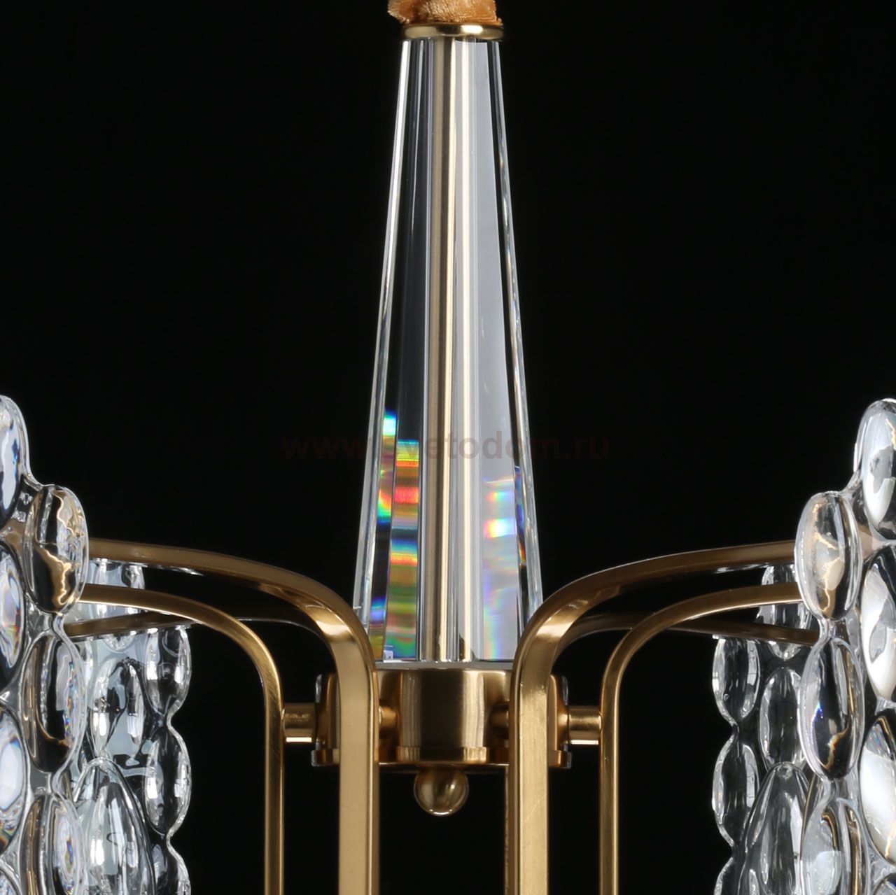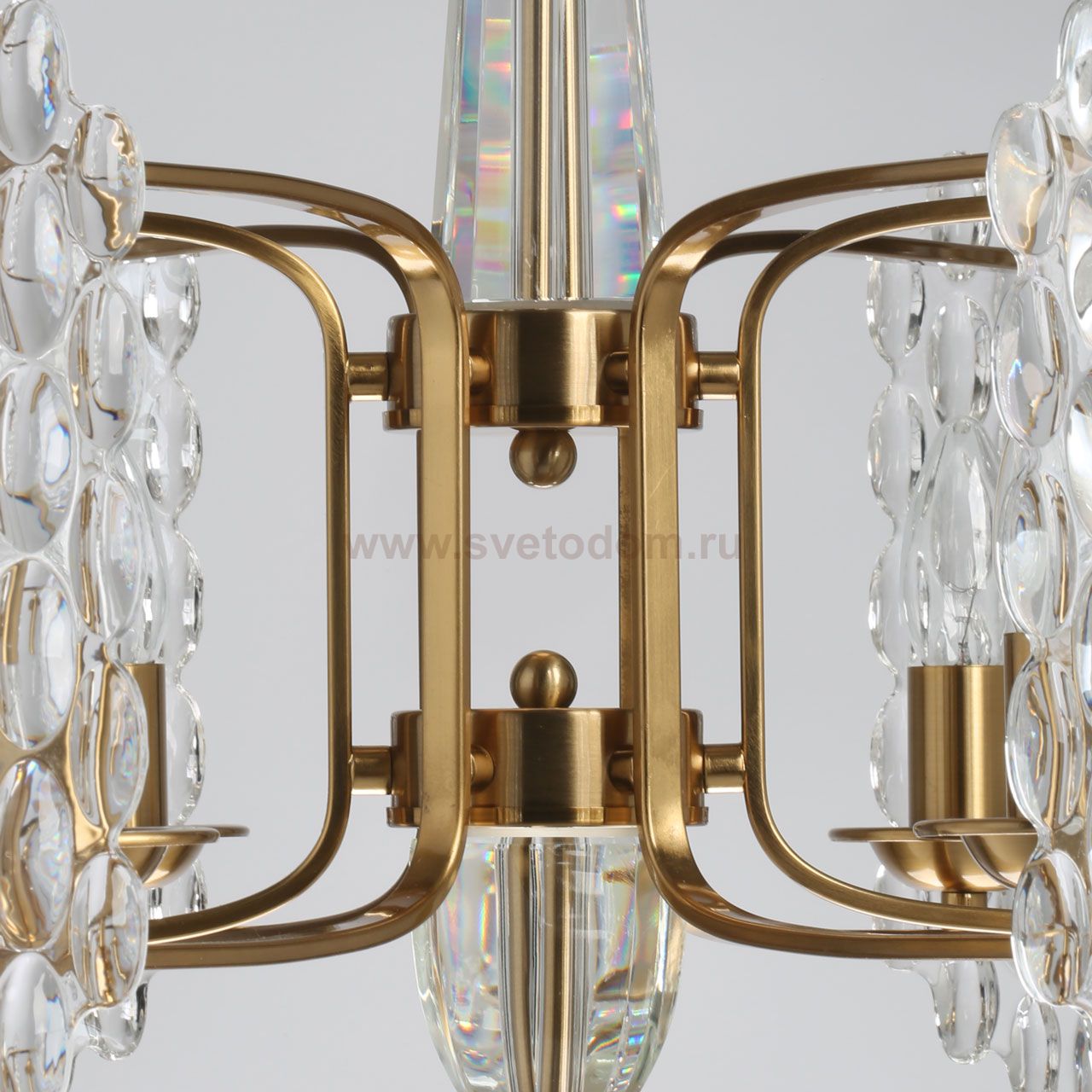 Металлическое основание подвесной люстры гальванизировано в цвет латуни. Источники света закрыты плафонами в виде пластин из фактурного стекла с крупным упорядоченным орнаментом фактуры. Центральная часть люстры декорирована прозрачными массивами хрусталя ручной калибровки. Комментарий