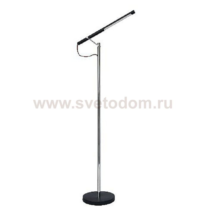 Арматура торшера металлическая. Стержень гальванизирован хромом. Основание с утяжелителем для большей устойчивости, окрашено в черный цвет. Поворотный механизм у основания крепления плафона. Металлический плафон в виде удлиненной трубки, окрашен плотным слоем черного цвета. Комментарий
