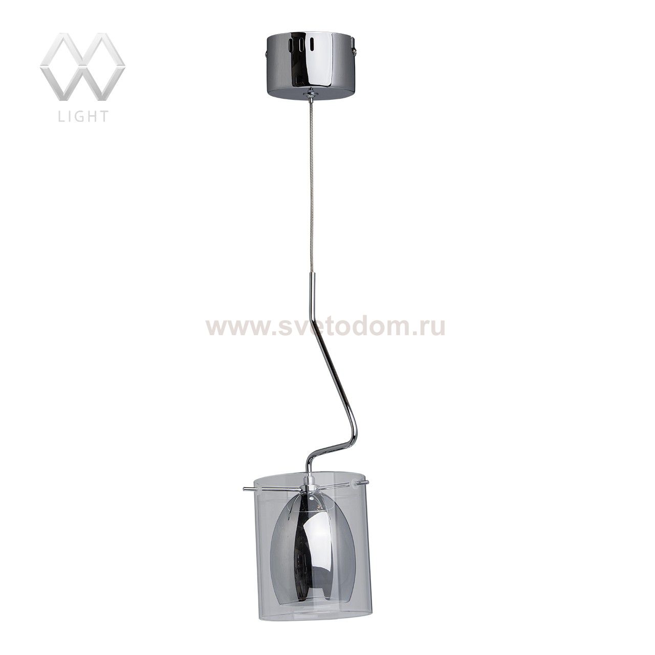 Арматура: сплав железа, гальванизированный в цвет хрома. Подвес декоративно изогнут. Двойной плафон: внутренний выполнен из сплава железа и гальванизирован в цвет хрома, окрашен изнутри в белый цвет, внешний – из прозрачного стекла. Комментарий