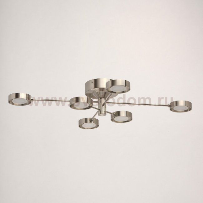 Основание выполнено из комбинации сплавов металлов и гальванизировано в цвет сатинового никеля.Потолочная чаша - сплав металла, прессование.Плафоны и декоративные элементы на плафонах - сплав алюминия. Светодиодные источники света типа SMD Chip закрыты рассеивателем из белого матового акрила. Комментарий