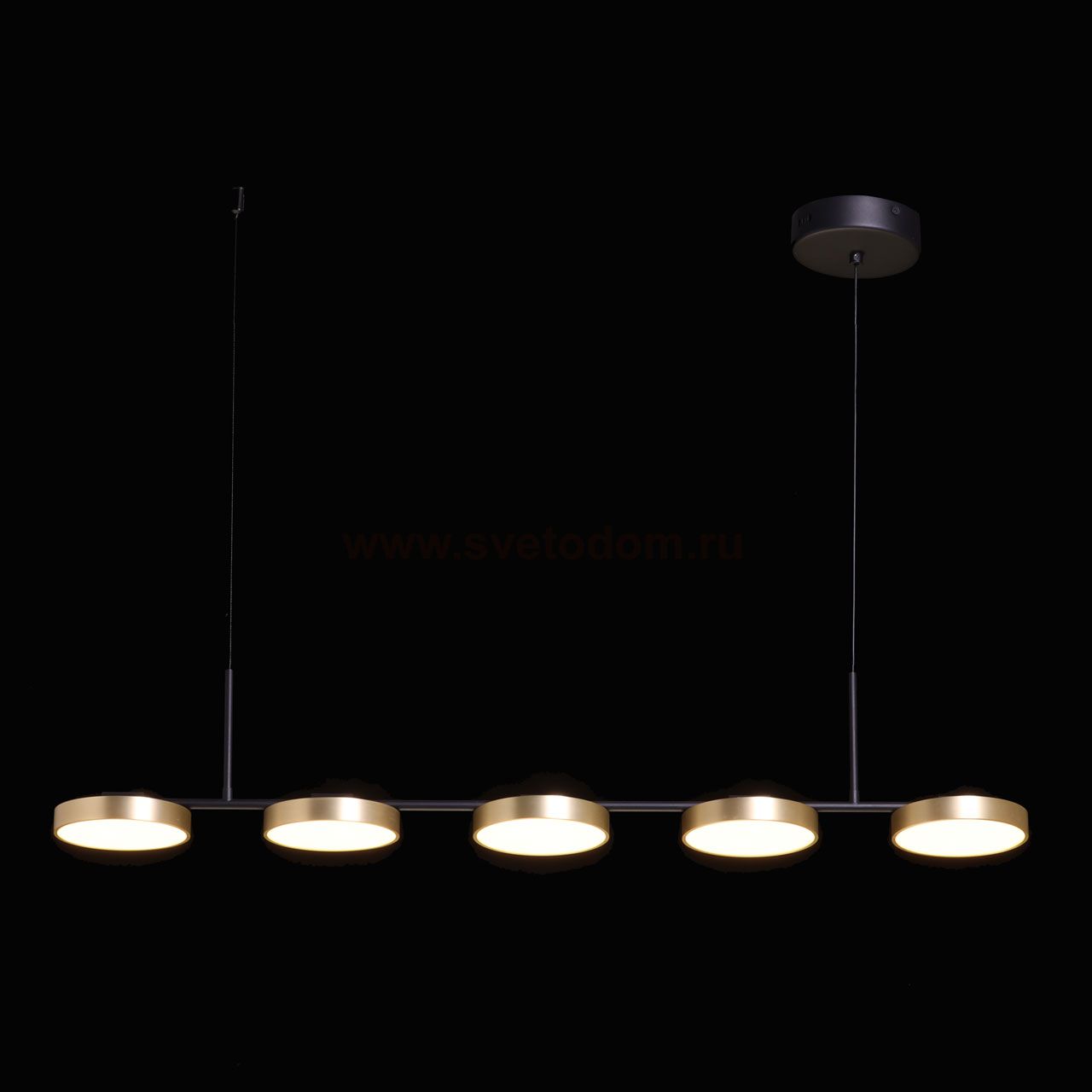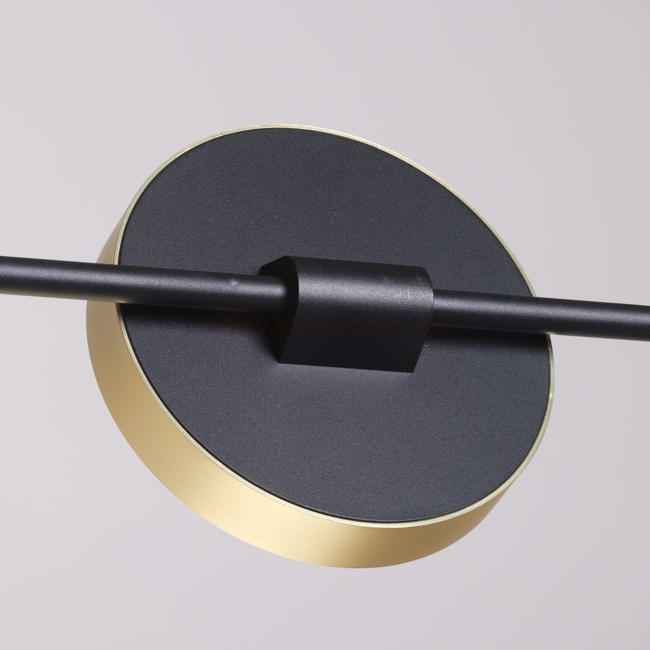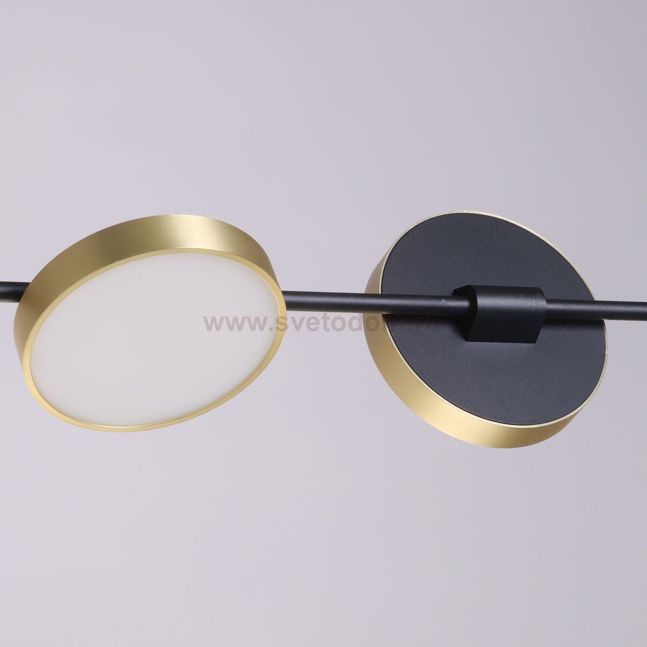 Металлическое основание подвесной люстры окрашено в черный цвет. Плафоны выполнены из сплава алюминия и гальванизированы в цвет золота. Светодиодные источники света закрыты белым матовым акрилом.
