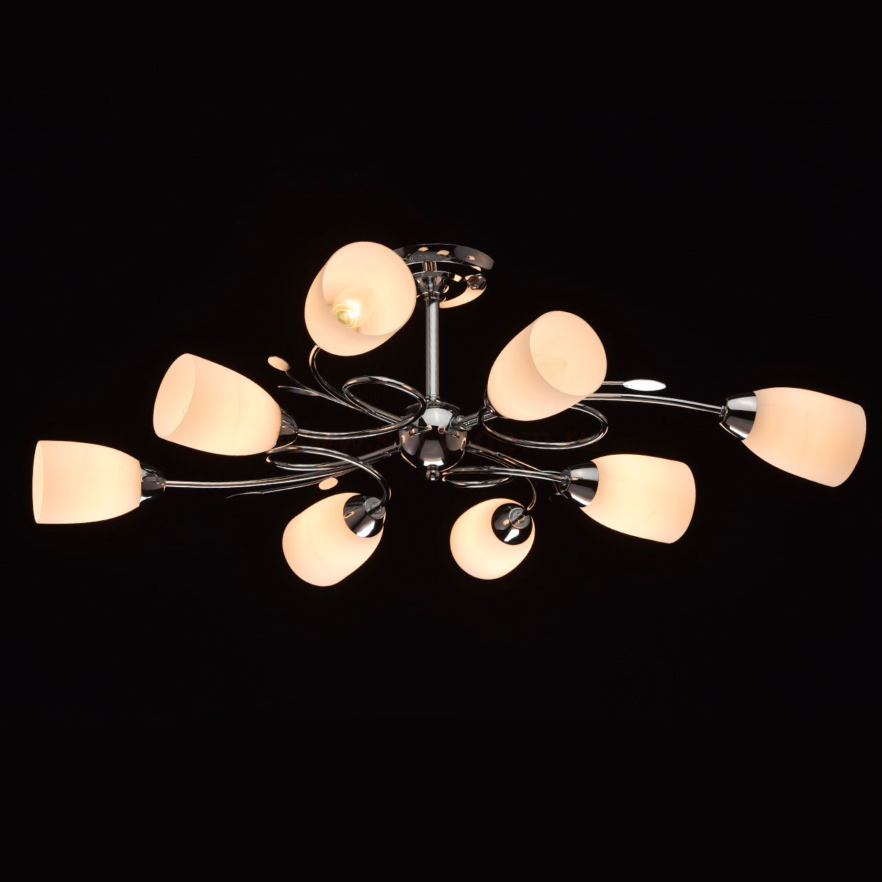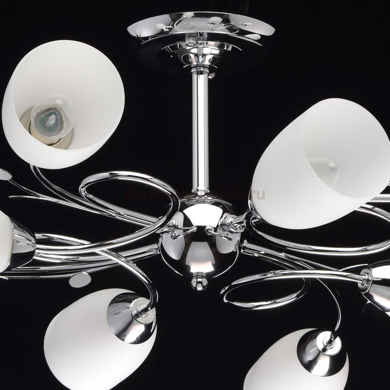 Люстра из коллекции «Олимпия» идеально дополнит интерьер городского жителя. Хромированное металлическое основание создает гармоничный дуэт с оригинально расположенными витыми рожками. Металлический оттенок прекрасно подчеркнут матовыми стеклянными плафонами. Декор в виде нежных завитков и стеклянные элементы оживляют композицию.