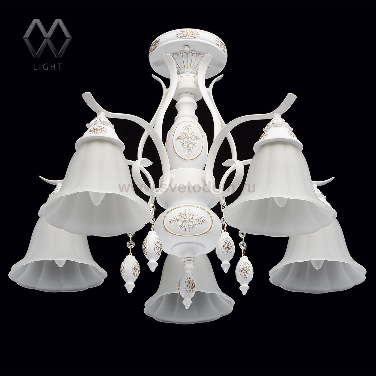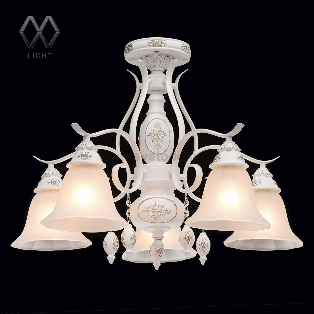 Арматура из сплава железа, легкая ковка, покрыта плотным слоем белой, матовой краски. Светильник декорирован искусственным каучуком. На медальонах из этого вида материала многократно повторяющаяся ручная роспись матовой краской в цвет золота. Комментарий