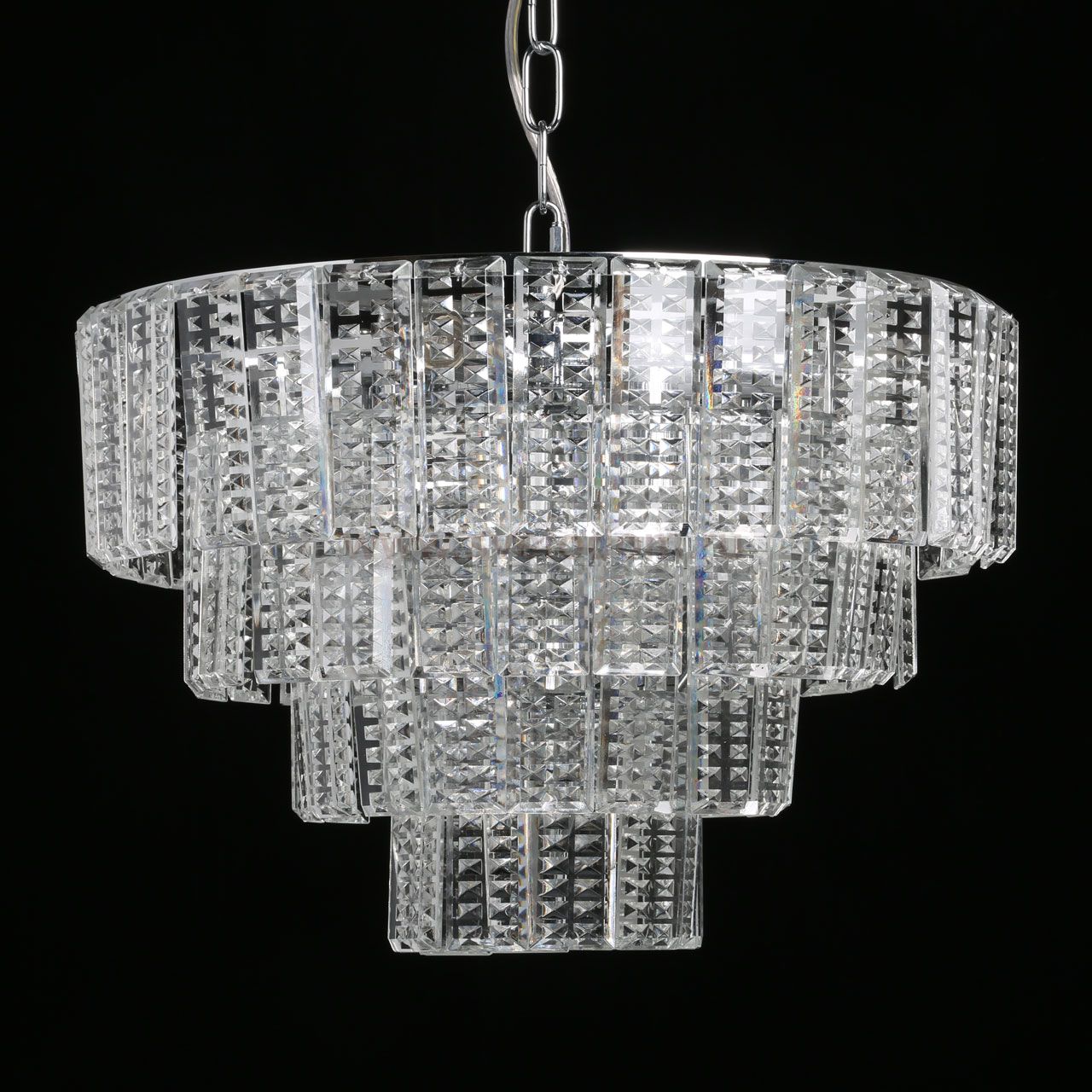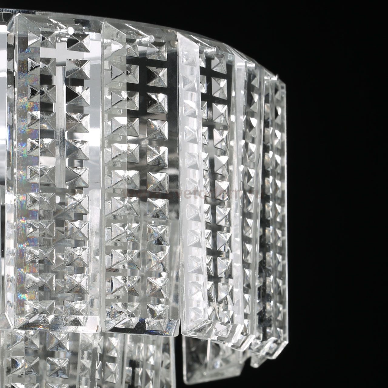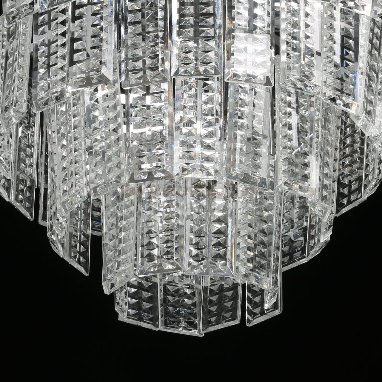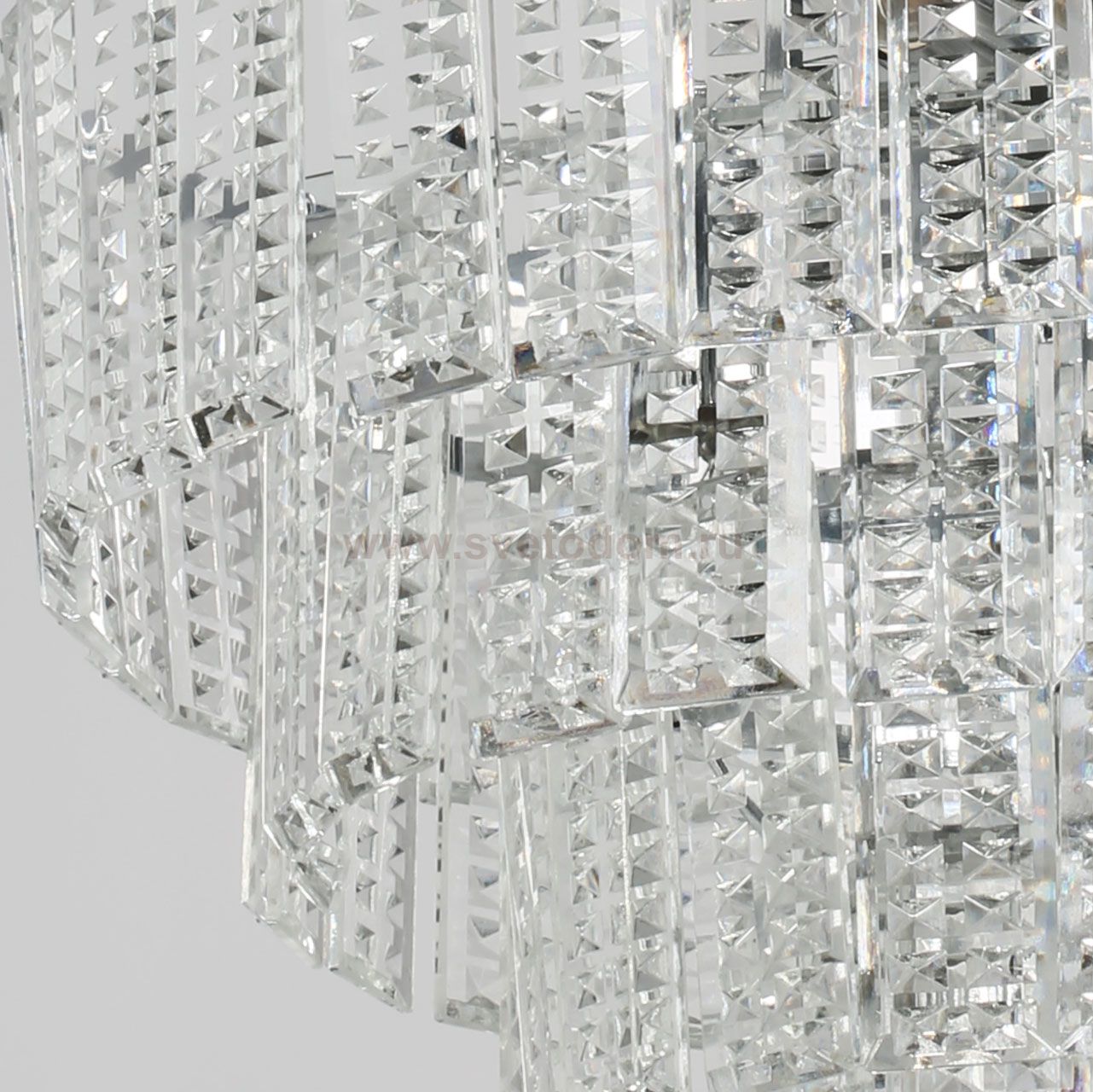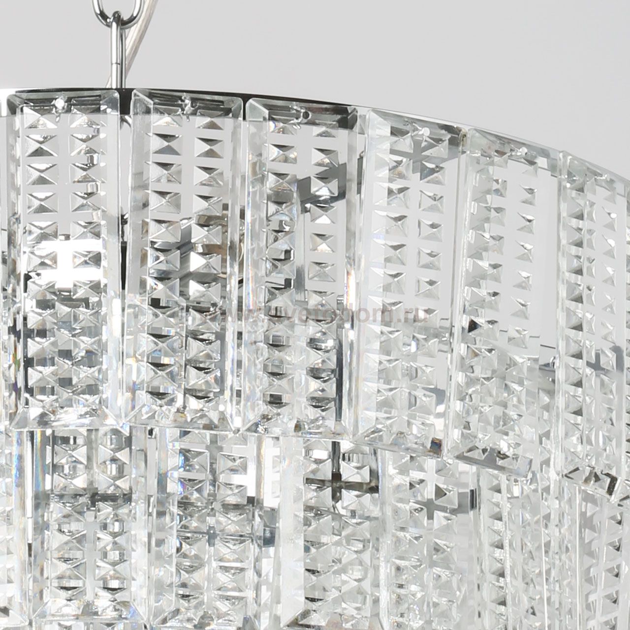 Металлическое основание подвесной люстры гальванизировано в цвет хрома. Люстра декорирована прозрачным фактурным хрусталем прямоугольной формы. Комментарий