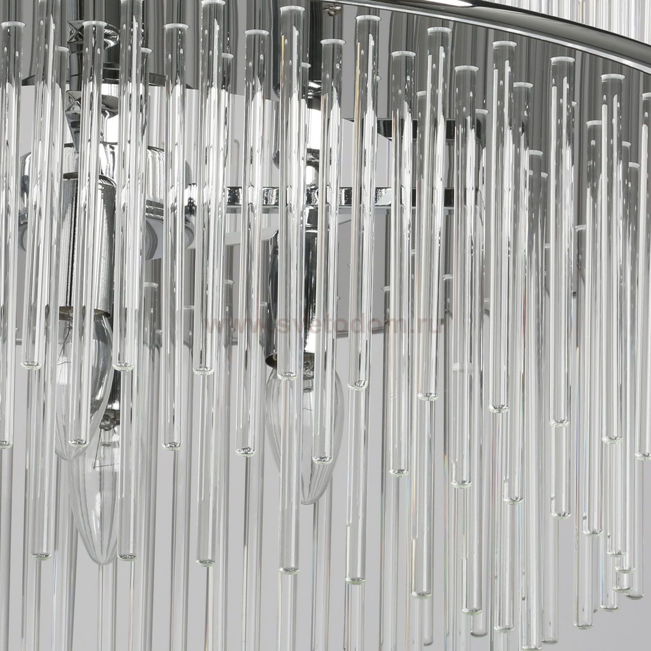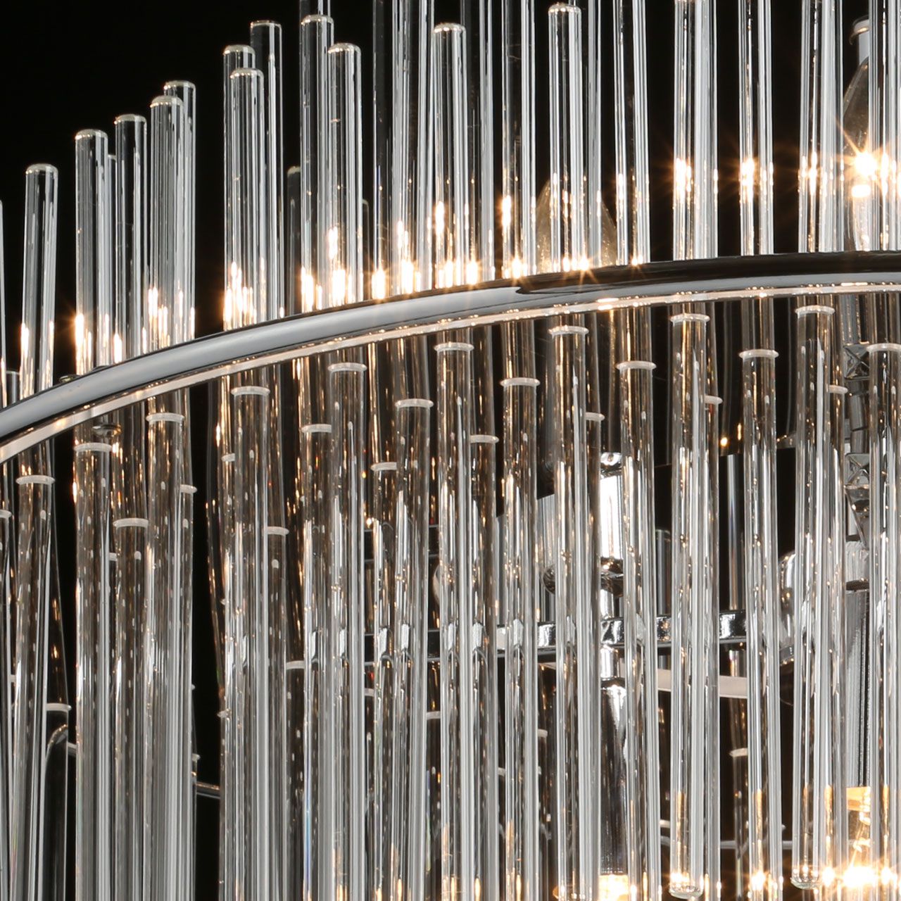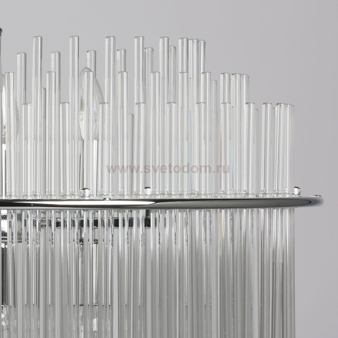 Металлическое основание светильника гальванизировано в цвет хрома. Светильник декорирован прозрачным стеклом в виде трубочек. Стеклянный декор крепится на пластину из нержавеющей стали, отполированной до зеркального блеска. Комментарий
