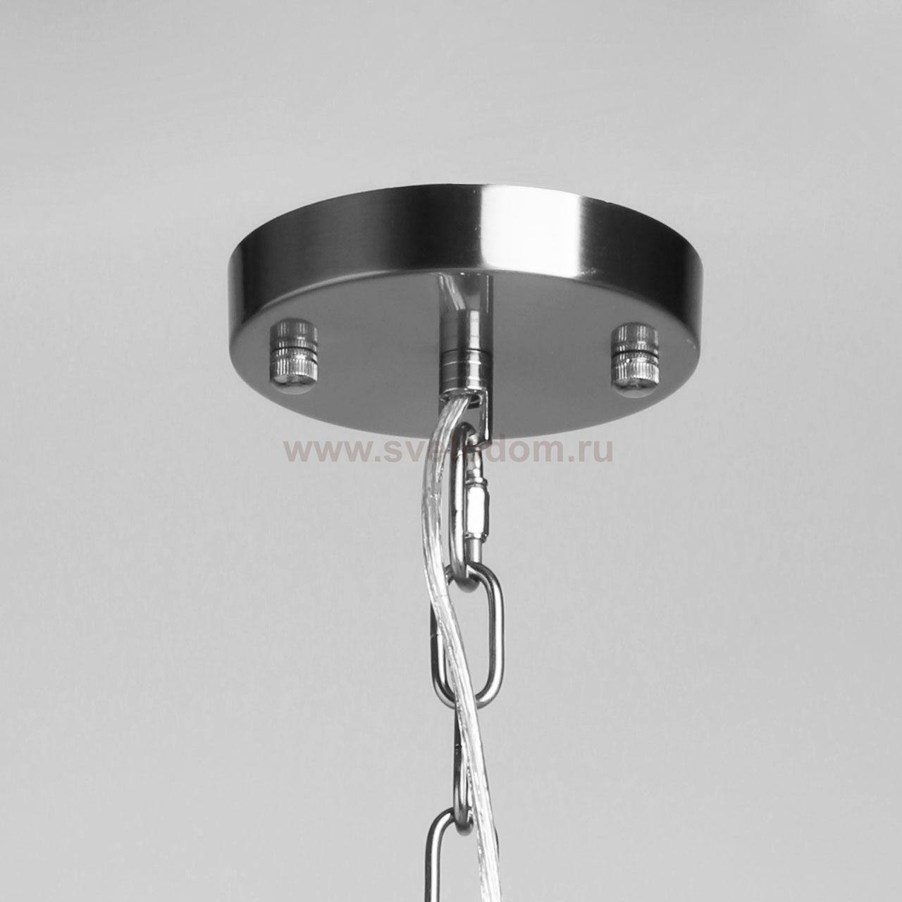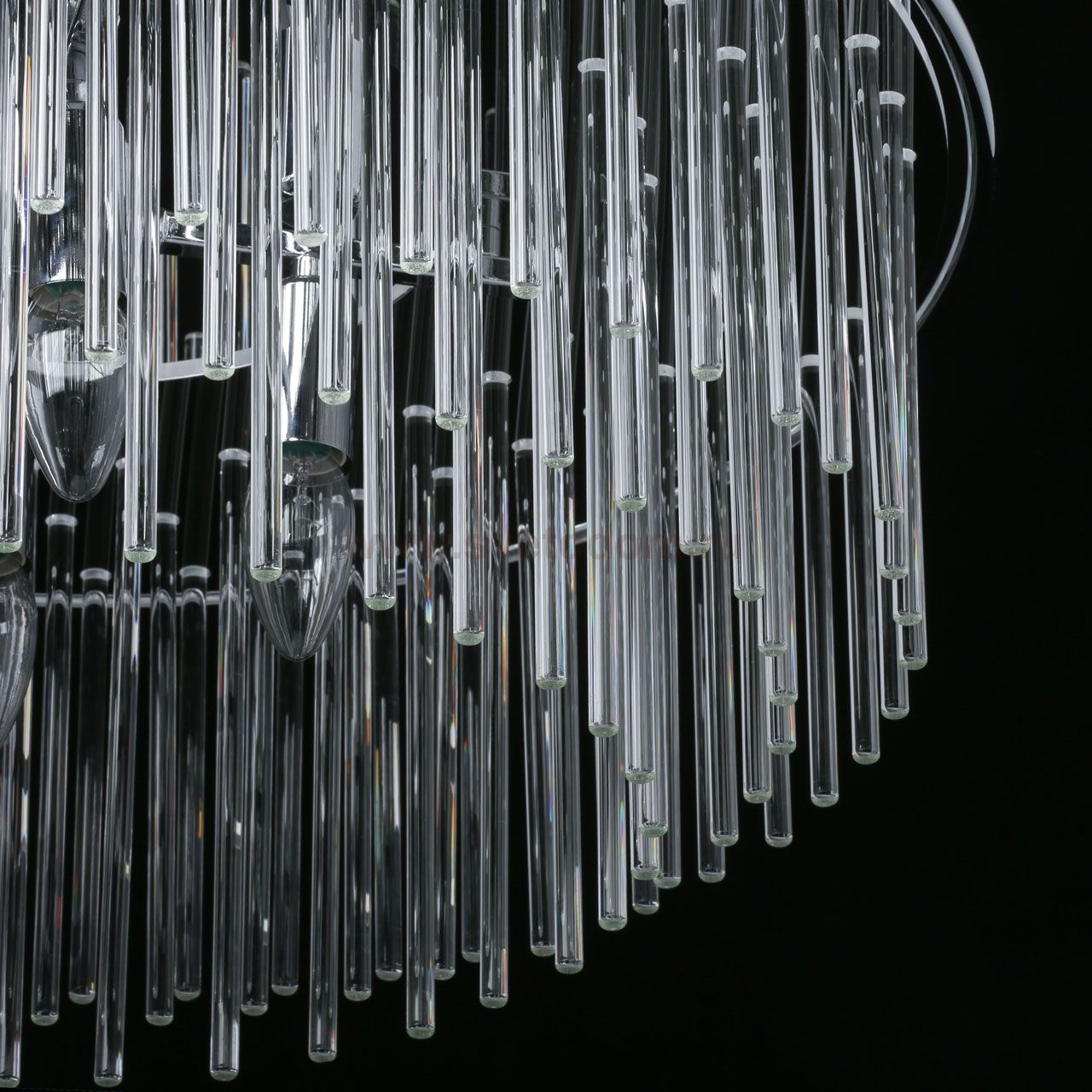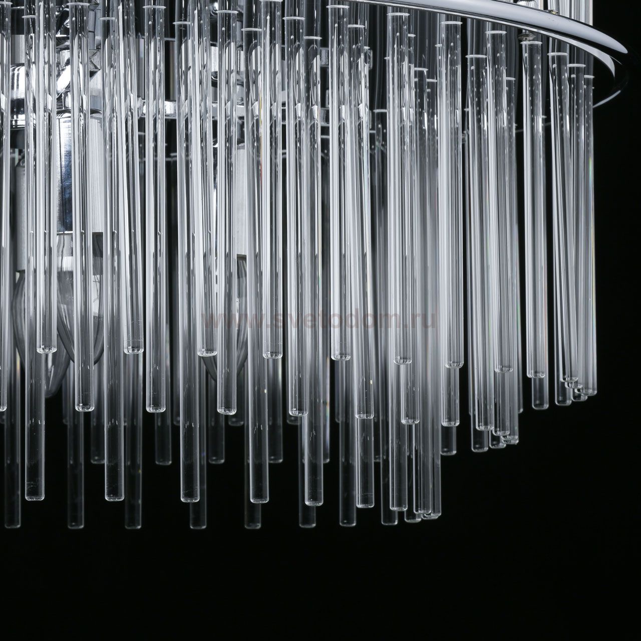 Металлическое основание светильника гальванизировано в цвет хрома. Светильник декорирован прозрачным стеклом в виде трубочек. Стеклянный декор крепится на пластину из нержавеющей стали, отполированной до зеркального блеска. Комментарий