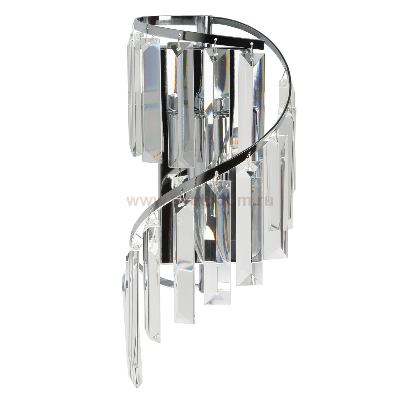Металлическое основание настенного бра гальванизировано в цвет хрома. Бра декорировано прозрачным хрусталем вытянутой формы. Комментарий