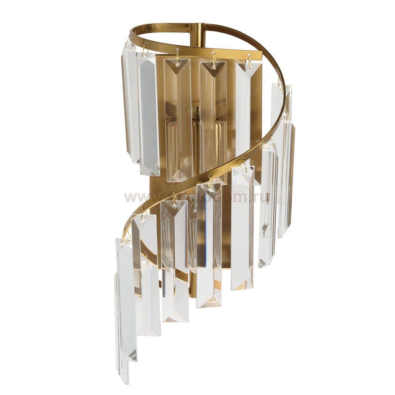 Металлическое основание настенного бра гальванизировано в цвет золота. Бра декорировано прозрачным хрусталем вытянутой формы. Комментарий