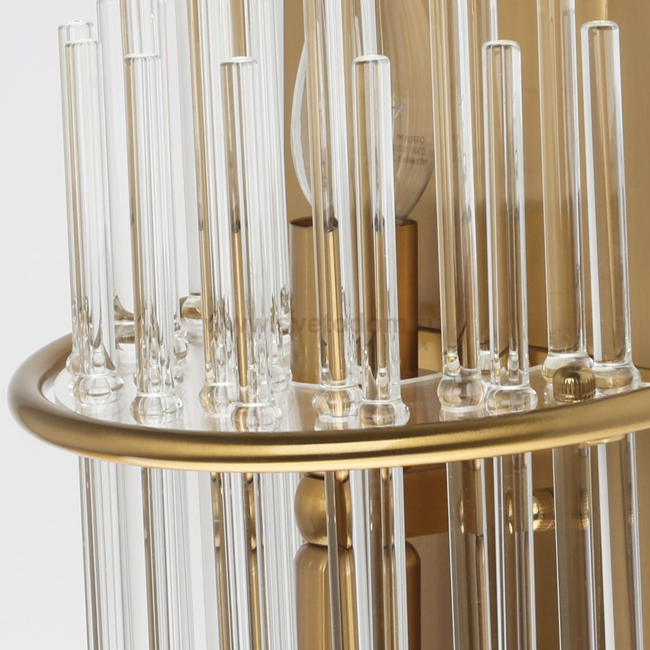 Металлическое основание настенного бра гальванизировано в цвет золота. Светильник декорирован прозрачным стеклом в виде трубочек. Стеклянный декор крепится на пластину из нержавеющей стали, отполированной до зеркального блеска. Комментарий