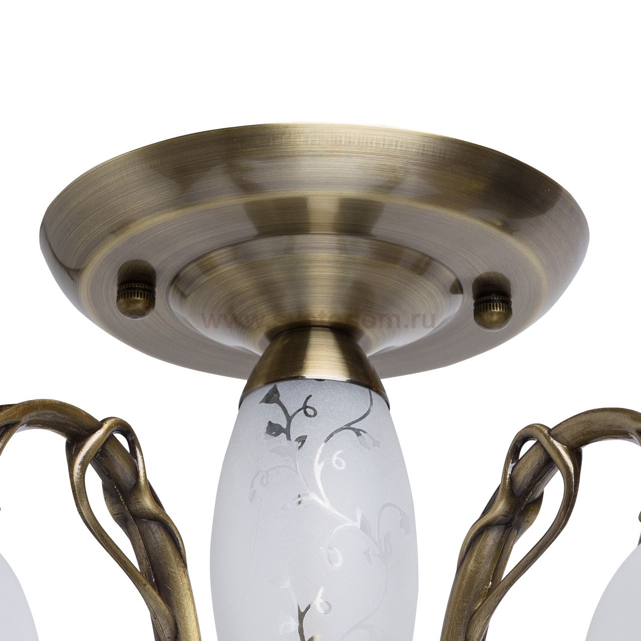 Арматура светильника выполнена из комбинации различных сплавов металлов и гальванизирована в цвет бронзы. Рожки выполнены по технологии художественного литья. Центральная ось декорирована стеклом с нанесенным рисунком по технологии пескоструйного матирования по шаблону. Плафоны выполнены из прозрачного стекла, декорированного рисунком, нанесенным пескоструйным матированием по шаблону. Рисунок на плафонах повторяет рисунок на декоративном элементе на центральной оси. Комментарий