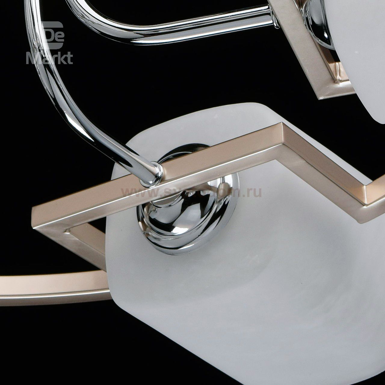 Арматура светильника выполнена из сплава железа. Основание и декоративные элементы окрашены в цвет перламутрового золота. Рожки гальванизированы в цвет хрома. Светильник декорирован плафонами из стекла с добавлением алебастра. Комментарий