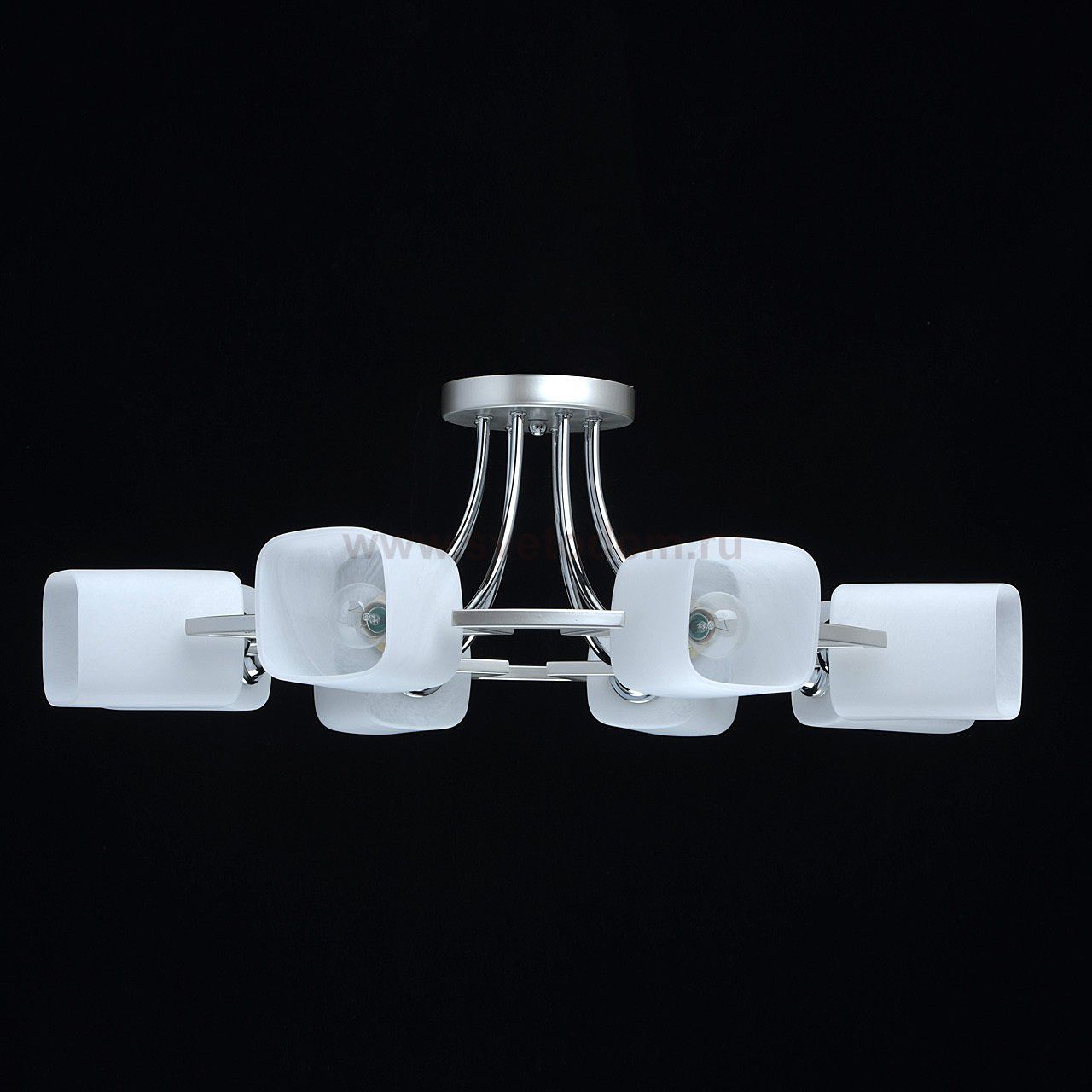 Основание светильника выполнено из металла. Рожки гальванизированы в цвет хрома. Держатели плафонов и потолочная чаша окрашены в цвет серебра. Светильник декорирован плафонами из алебастрового стекла, отлитыми в форму. Плафоны матированы. Комментарий