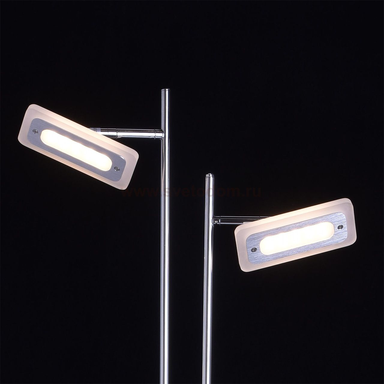 Арматура торшера выполнена из сплава металла и гальванизирована в цвет хрома. Корпус плафонов выполнен из сплава алюминия, сами плафоны - из матового белого акрила. Плафоны на шарнирах и имеют возможность изменения направления светового потока. Светильник снабжен диммером с функцией памяти - запоминает силу светового потока. Комментарий
