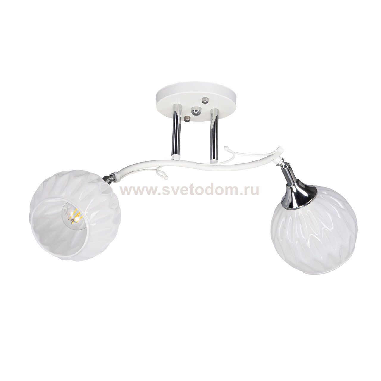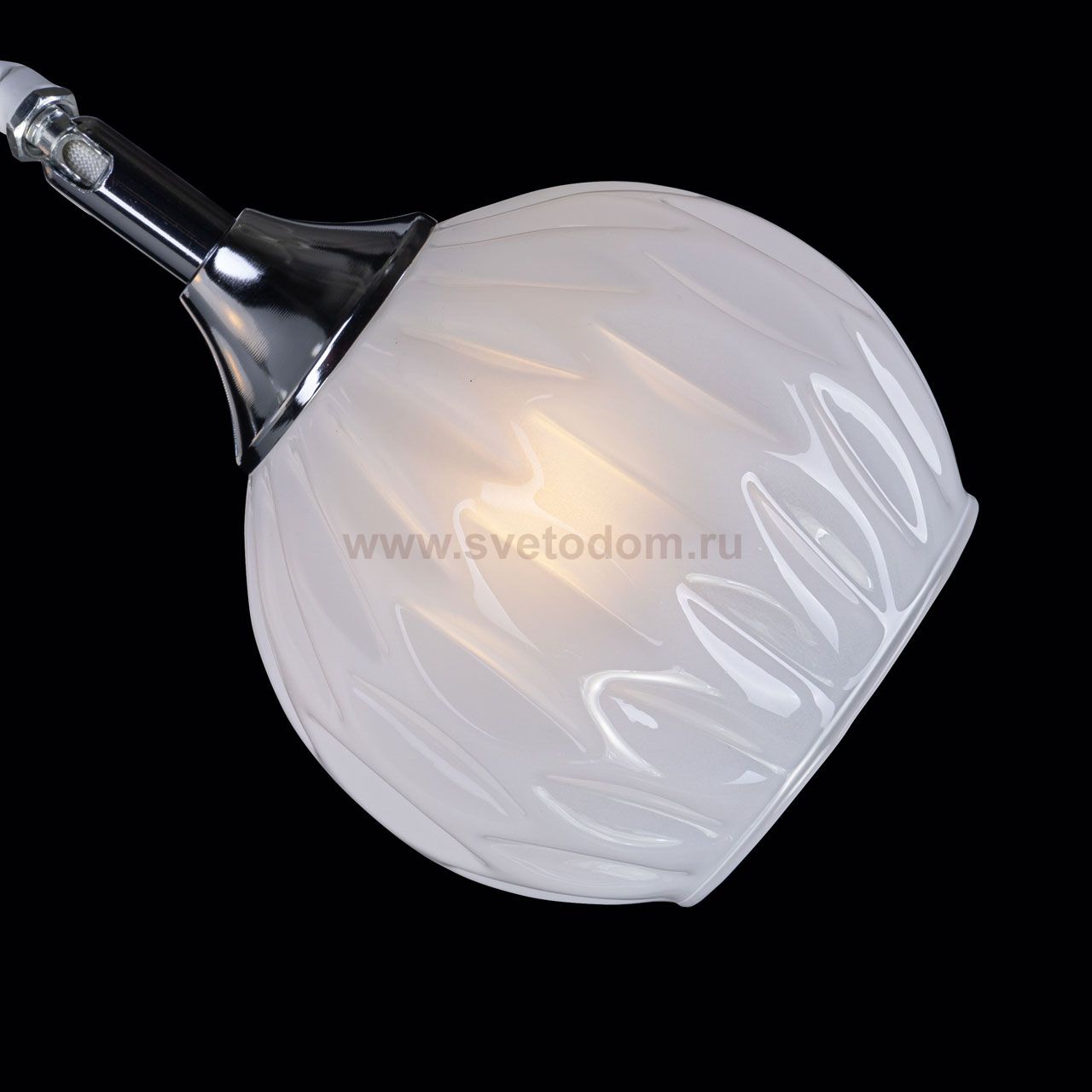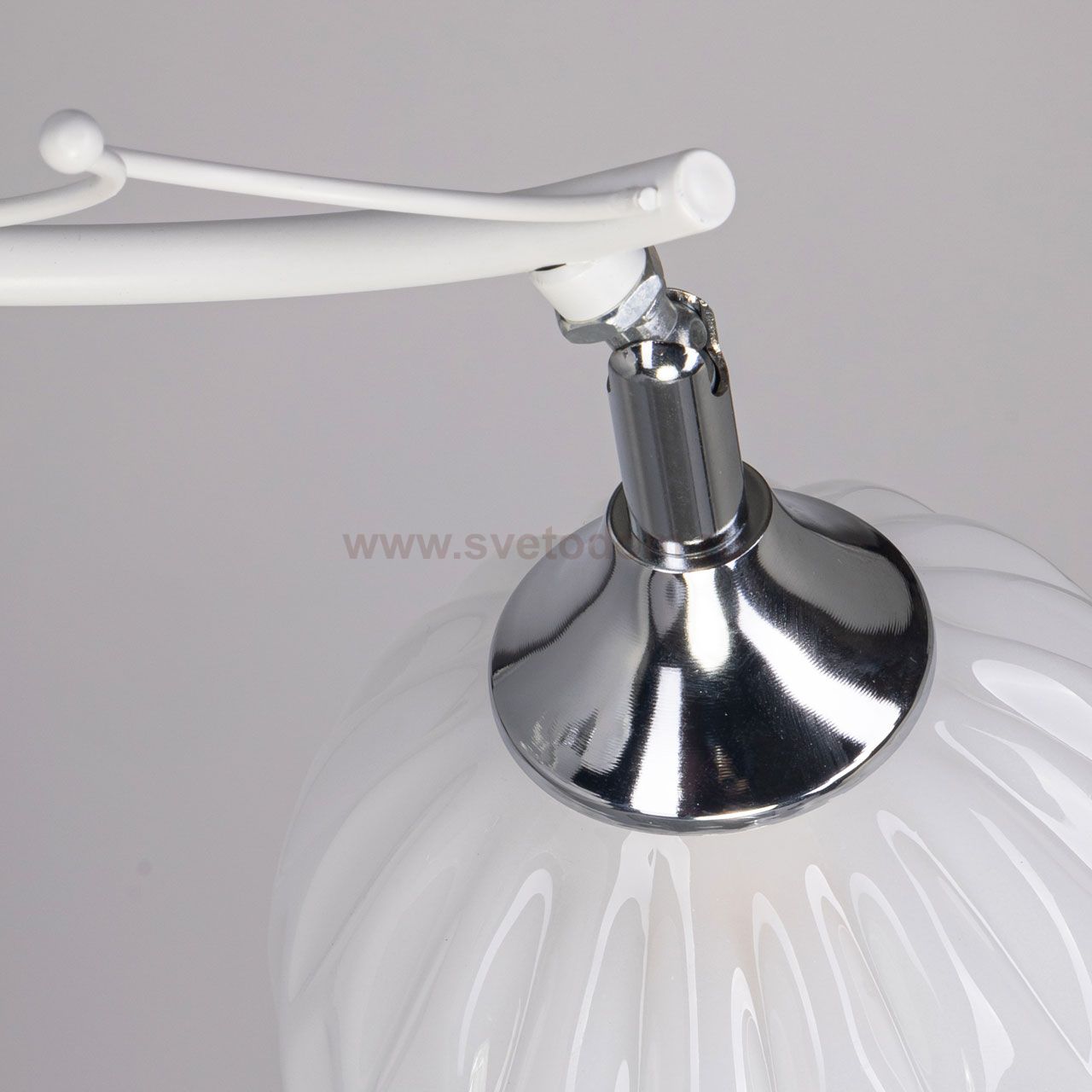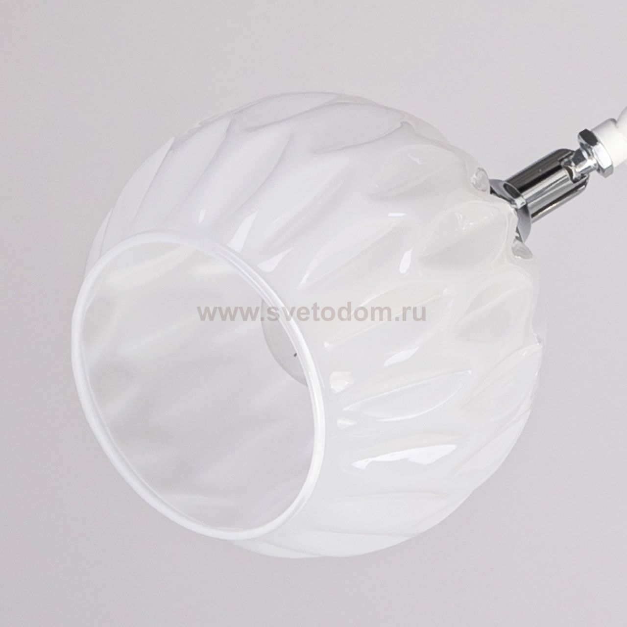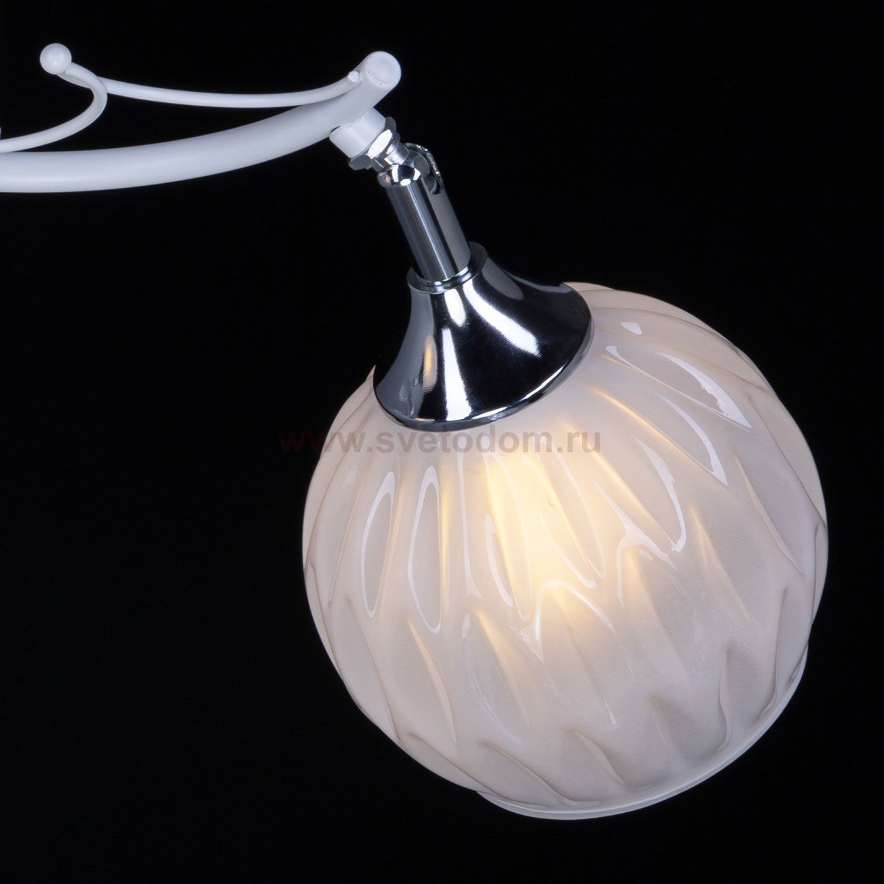 Металлическое основание потолочной люстры окрашено в белый цвет. Отдельные элементы основания гальванизированы в цвет хрома. Потолочная люстра декорирована белыми стеклянными плафонами сложной формы. Комментарий