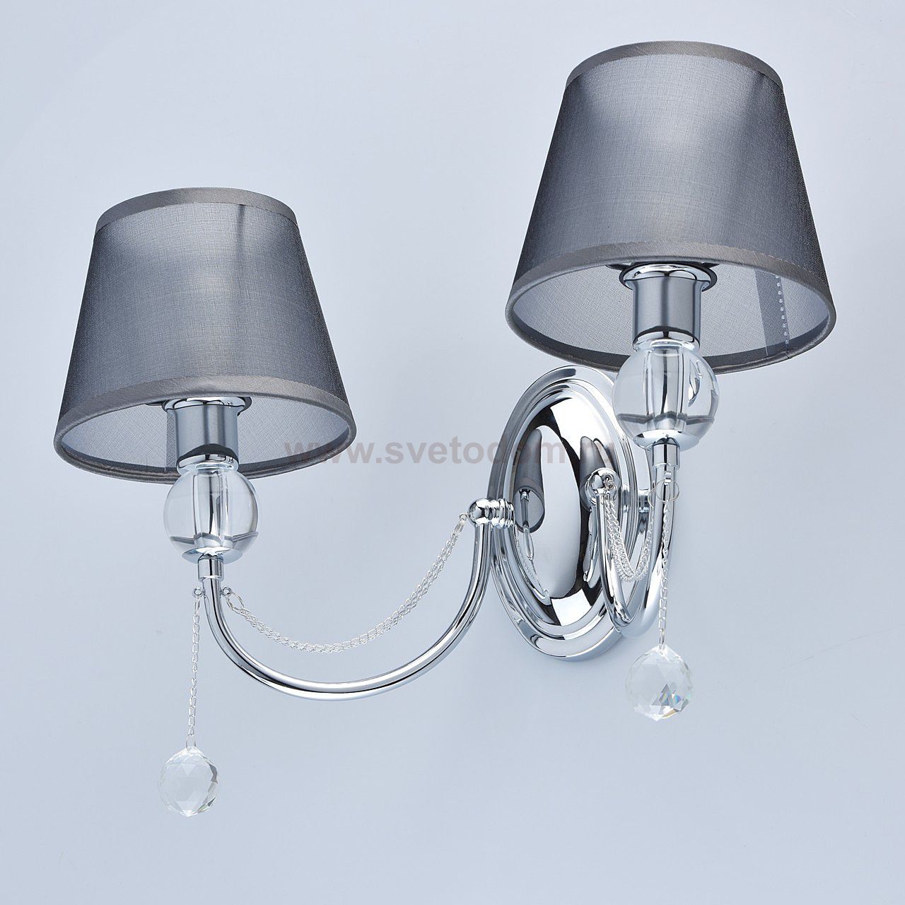 Металлическое основание цвета хрома. Текстильные абажуры дымчатого цвета. Декор - прозрачный акрил и хрусталь. Материал плафона