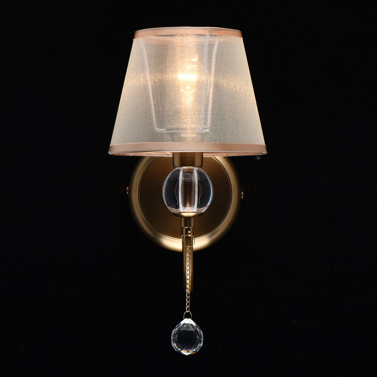 Основание бра выполнено из металла и гальванизировано в цвет золота с последующим матированием. Светильник декорирован текстильным абажуром из бежевой органзы с термостойким акрилом внутри. По краям абажур отделан кантом цвета золота. Рожок декорирован сферой из прозрачного акрила. Центральный подвес выполнен из хрусталя формы шар. Комментарий