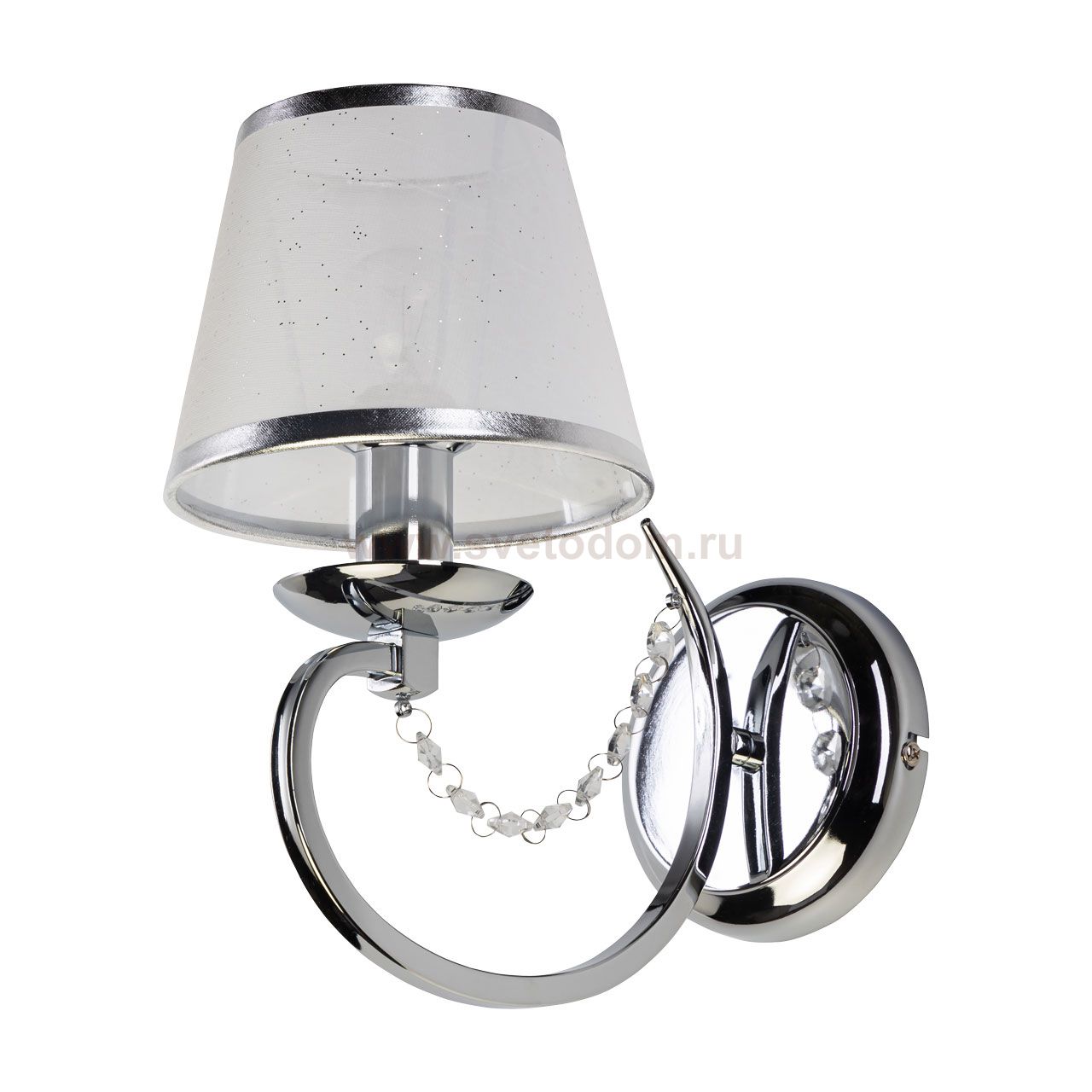 Металлическое основание бра гальванизировано в цвет хрома. Сменяемые источники света закрыты белым текстильным абажуром с термостойким акрилом внутри. Светильник декорирован прозрачным хрусталем в форме октагон. Комментарий