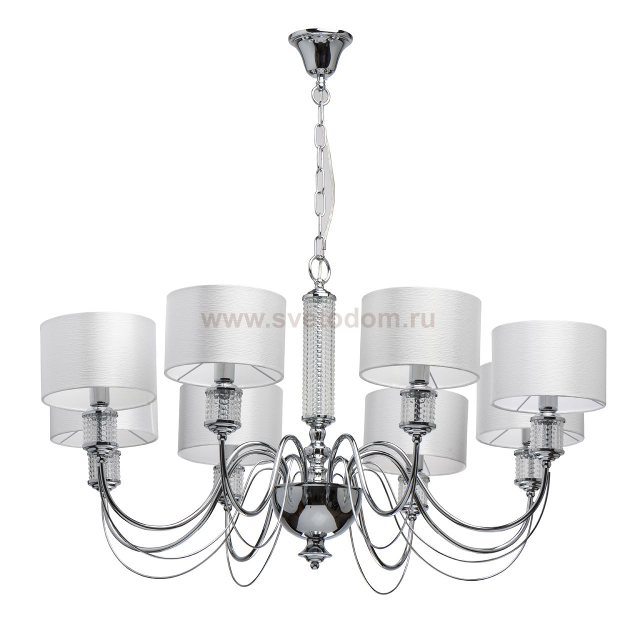 Основание светильника выполнено из металла и гальванизировано в цвет хрома. Текстильные абажура из белого атласа, внутри с термостойким акрилом, прошиты. Декор на рожках и центральной оси из прозрачного фактурного стекла. Комментарий