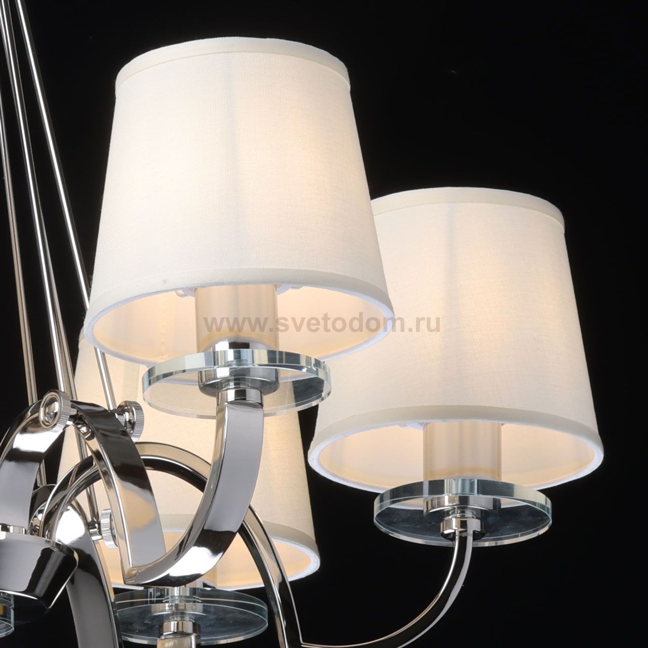 Металлическое основание светильника гальванизировано в цвет хрома. Источники света закрыты белыми текстильными абажурами с термостойким акрилом внутри. Светильник декорирован розетками и сферой из прозрачного массива хрусталя. Комментарий