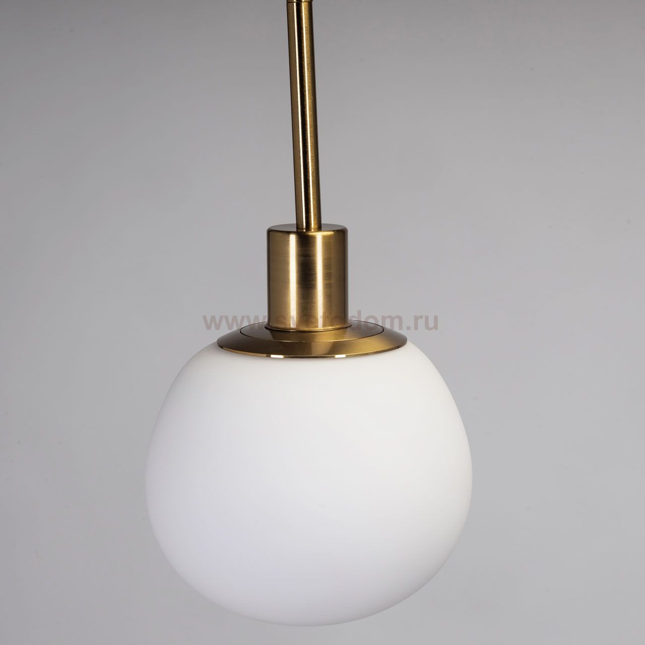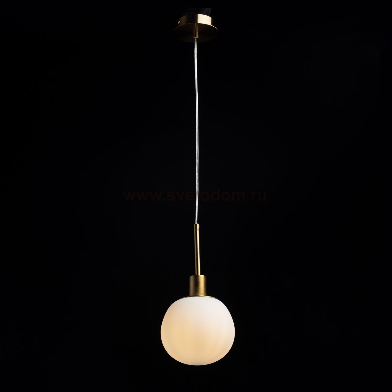 Металлическое основание подвеса гальванизировано в цвет латуни. Подвес декорирован плафоном из белого матового стекла округлой формы. Комментарий