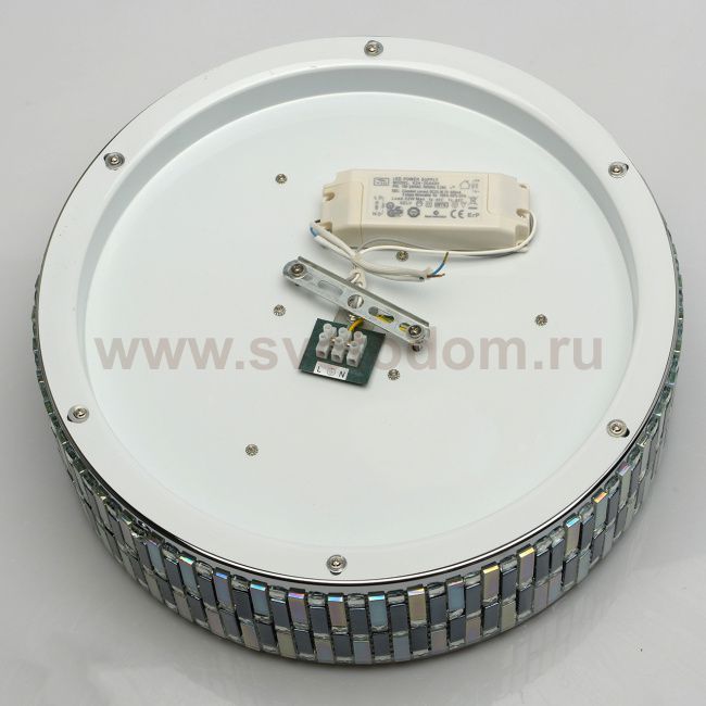 Основание светильника выполнено из металла и гальванизировано в цвет хрома. Корпус светильника декорирован витражным стеклом цвета хрома. Светодиодный источник света типа SMD-board закрыт рассеивателем из белого матового акрила.