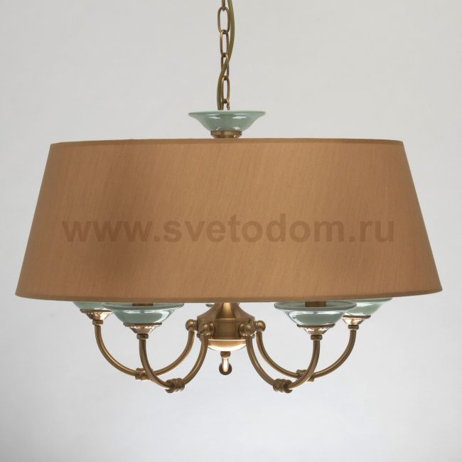 Основание светильника выполнено из металла и гальванизировано в цвет античной бронзы с последующим тональным лакированием. Рожки выполнены по технологии проката на роликовом станке, потолочная чаша выполнена по технологии прессования. Центральная ось и декоративные розетки выполнены из глазурированного фарфора мятного цвета. Фарфор состарен по технологии кракелирования. Абажур выполнен из фактурной ткани коричневого цвета с термостойким акрилом внутри. По краям абажура крепится кант в цвет абажура, абажур прошит.