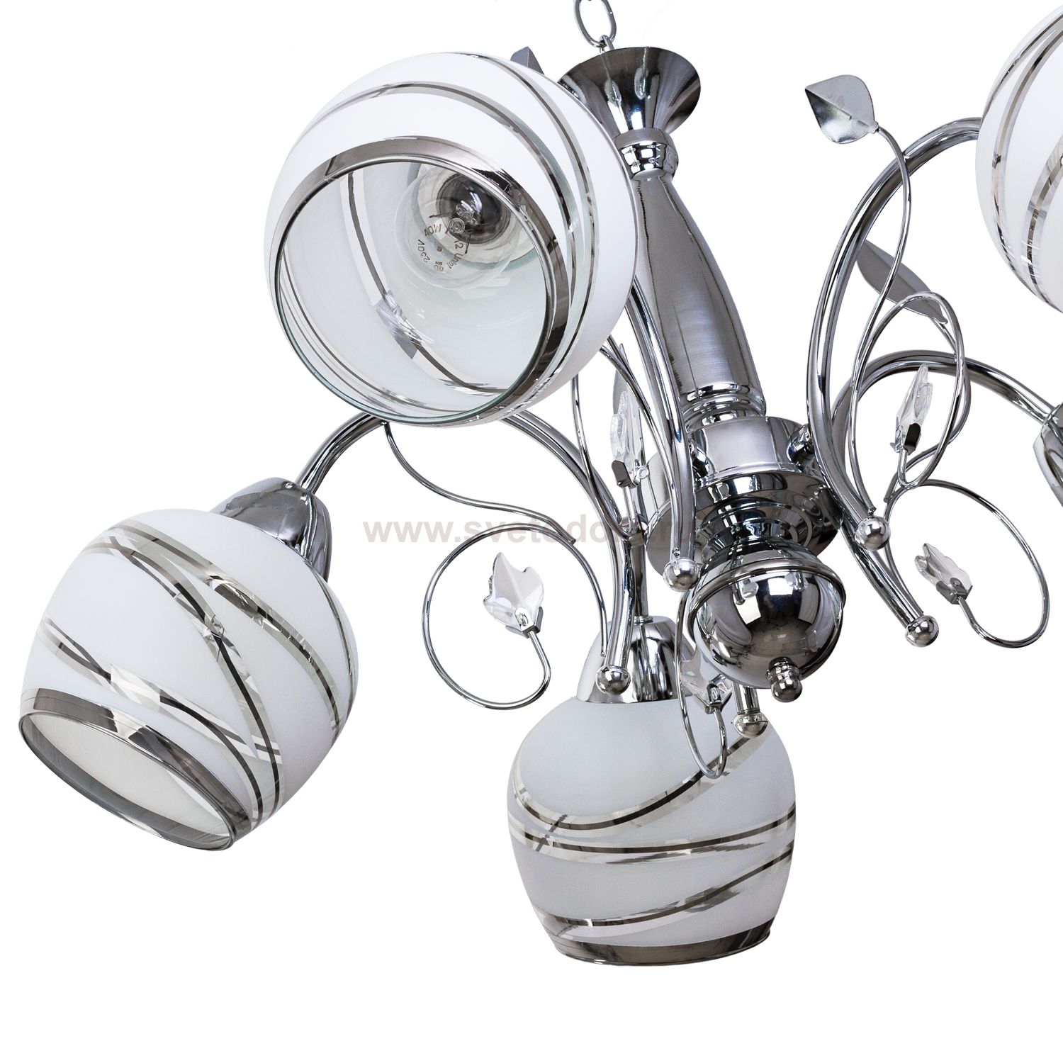 Потолочный светильник 7751V/5 от бренда ЭкономСвет. Каркас выполнен из материала металл, цвет хром. Плафоны (светорассеиватели) выполнены из материала стекло; цвета: белый и хром. Цоколь E27 рассчитан на лампы максимальной мощности до 40 Вт, а максимальная площадь освещения составит до 11 м?.