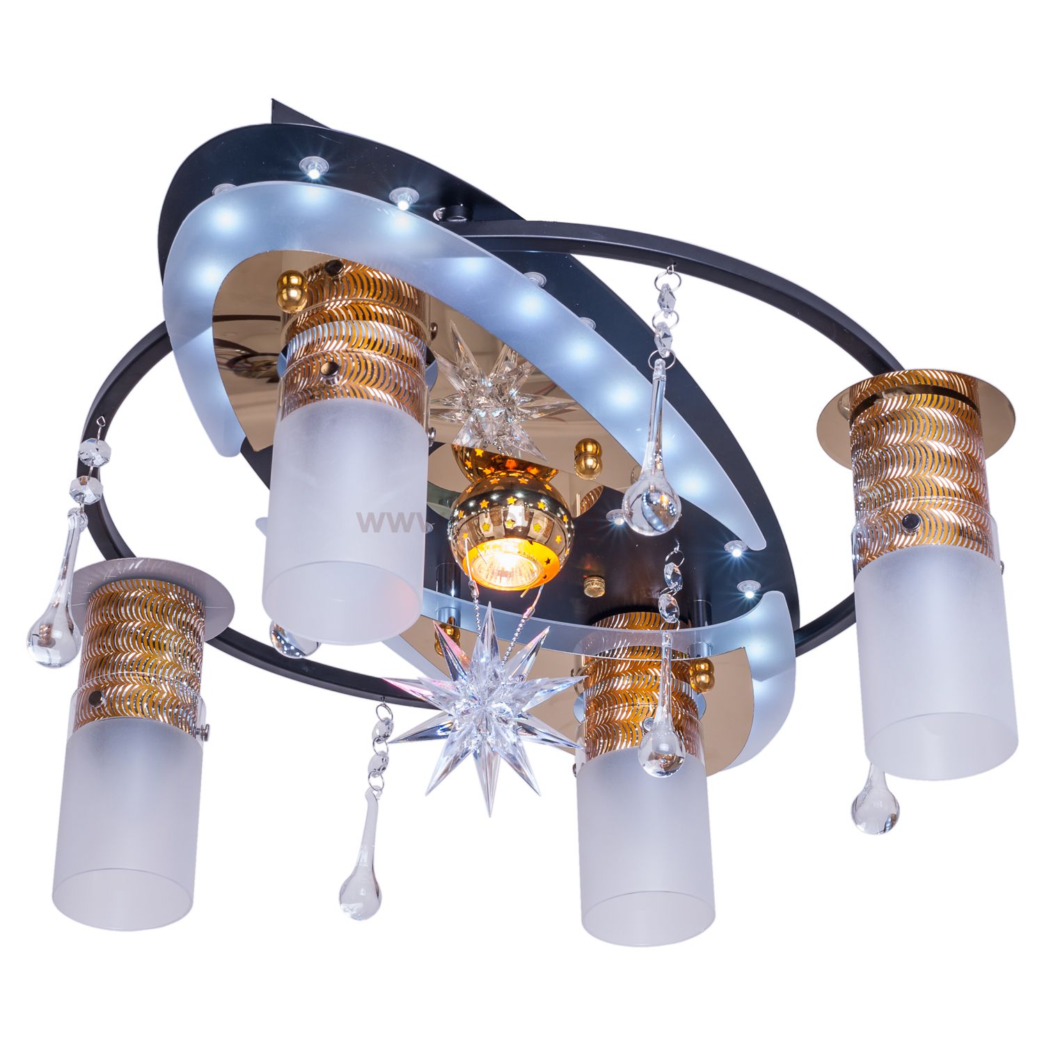Люстра в стиле Космос 8257/4+1BK GD RC LED с пультом дистанционного управления от бренда ЭкономСвет. Каркас выполнен из материала металл, цвет черный. Плафоны (светорассеиватели) выполнены из материалов металл и стекло; цвета: белый и золото. Цоколь E27 рассчитан на лампы максимальной мощности до 15 Вт, а максимальная площадь освещения составит до 4 м?. Светодиодная подсветка позволит создать в интерьере разнообразное световое настроение.