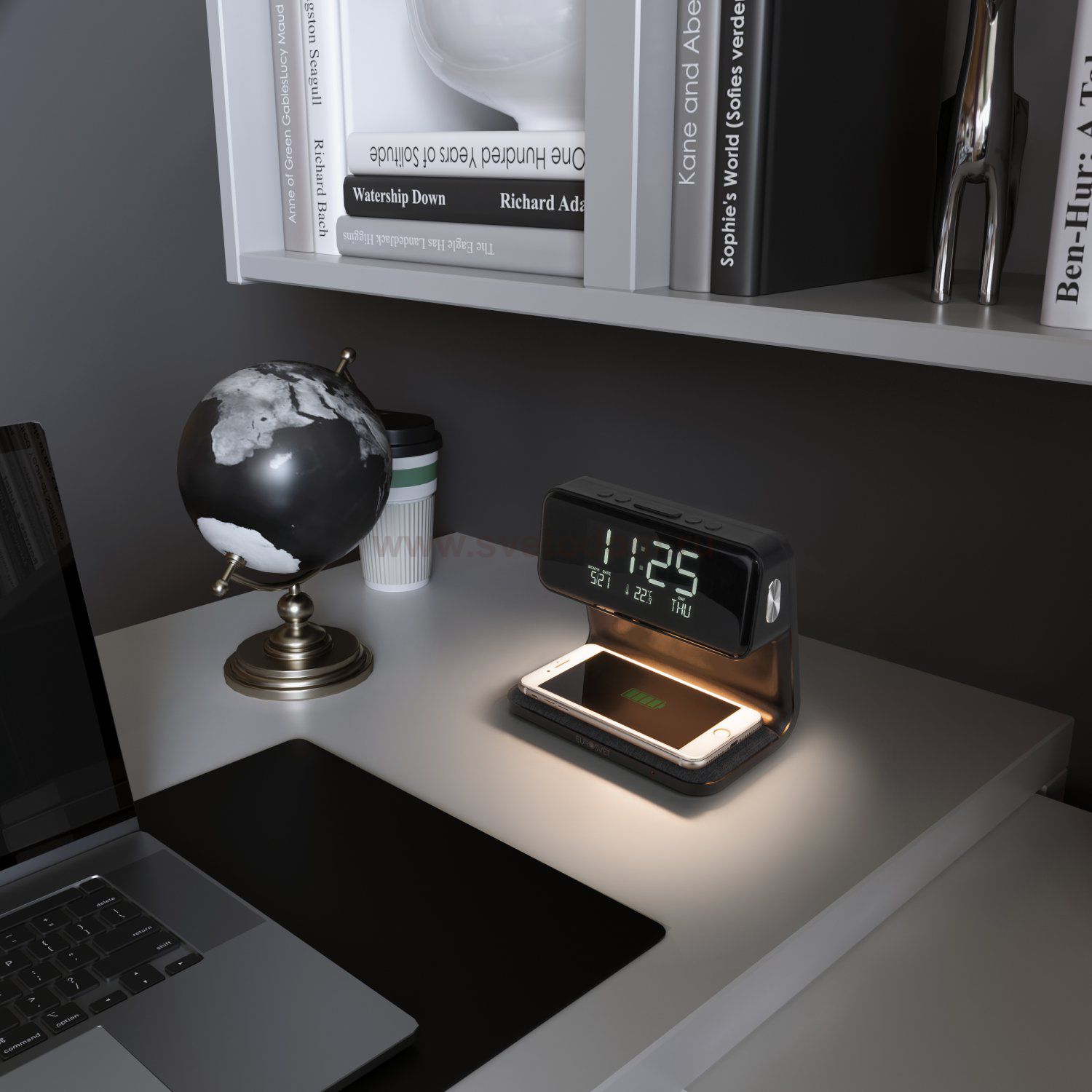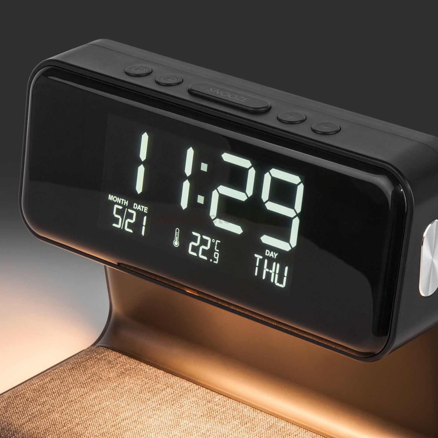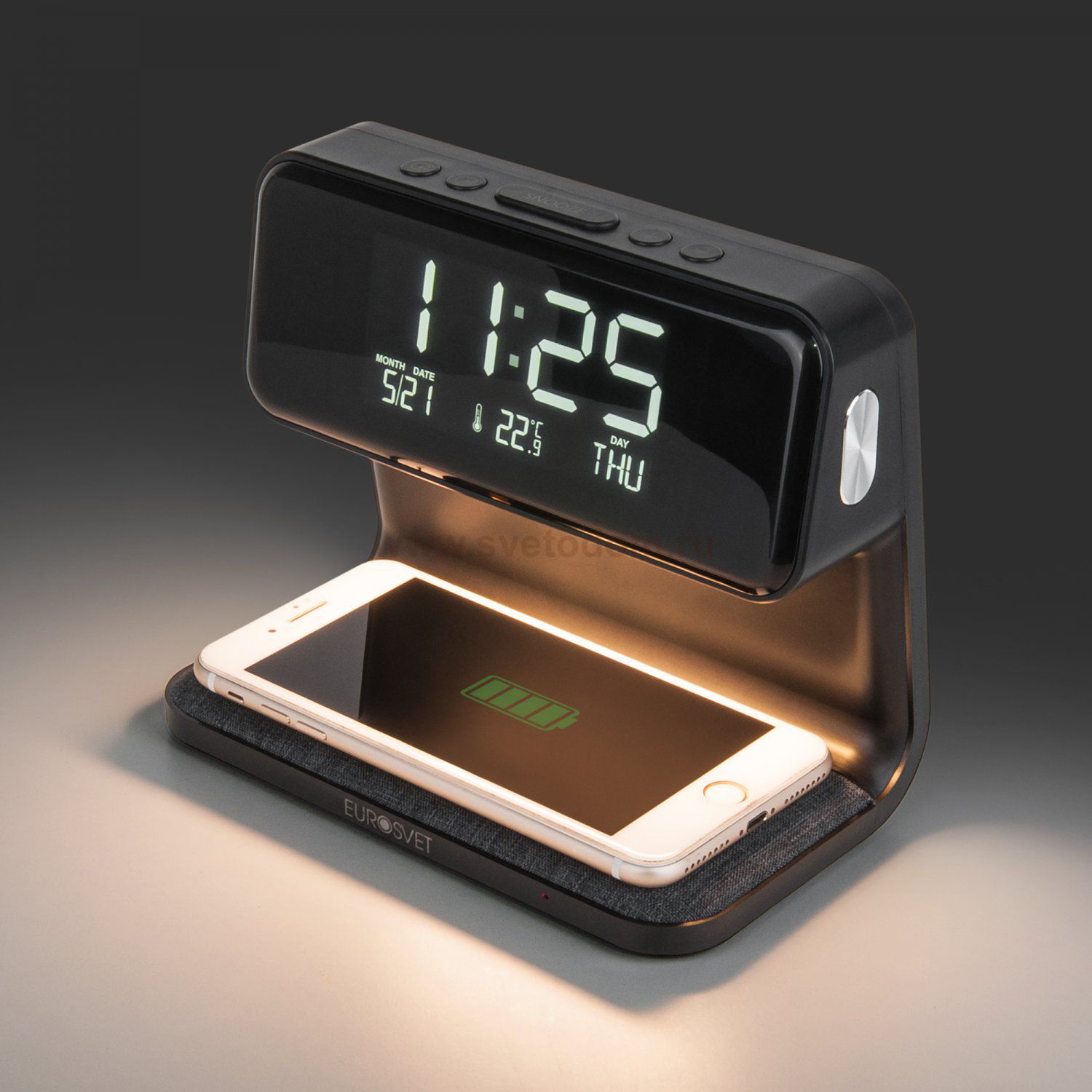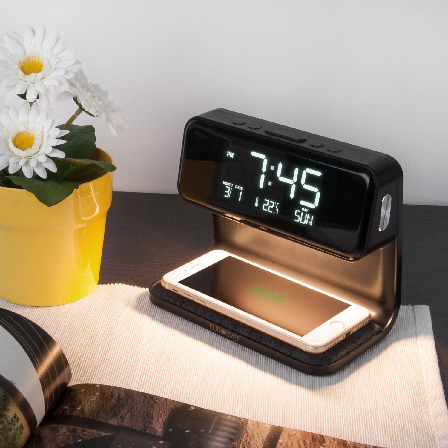 будильник; индукционная зарядка; календарь; сенсорное управление; термометр; часы; диммер Энергоэффективность