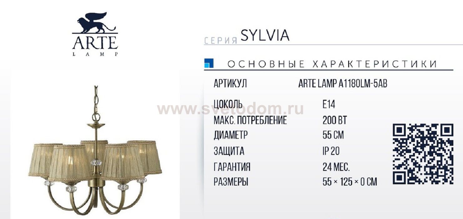 18 Отзывы Люстра подвесная Arte lamp A1180LM-5AB SYLVIAПока нет отзывов об этом товаре, напишите и он обязательно появится после модерации! Оставить свой отзывПохожие товары Другие товары магазина Фото