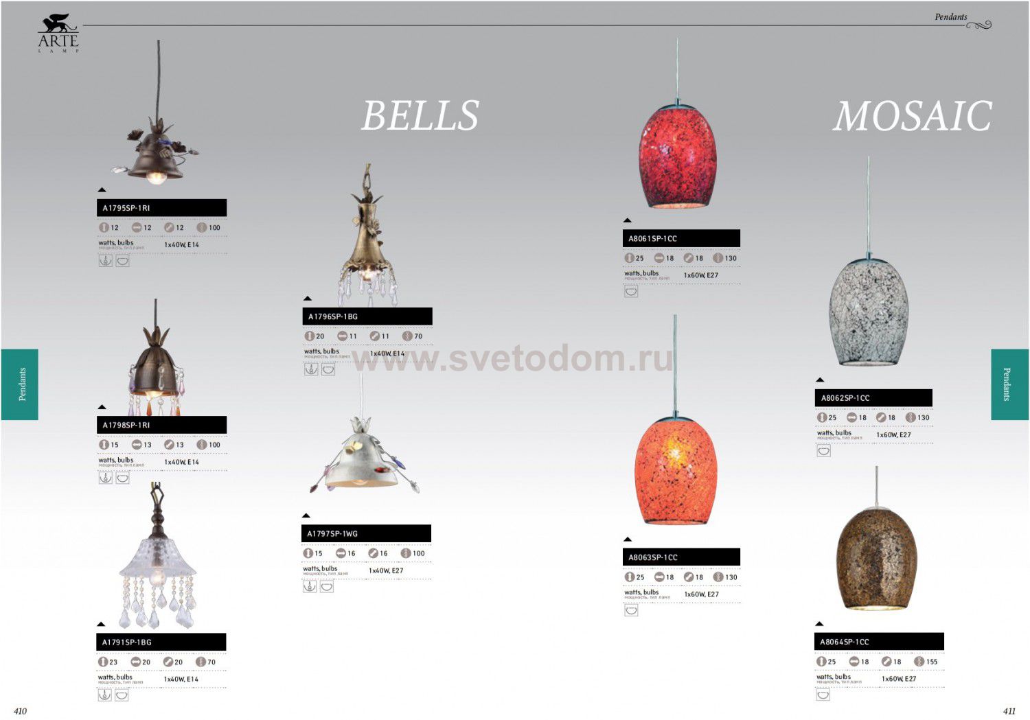46 Отзывы Подвесной светильник Arte lamp A1795SP-1RI BellsПока нет отзывов об этом товаре, напишите и он обязательно появится после модерации! Оставить свой отзывПохожие товары Другие товары магазина Фото
