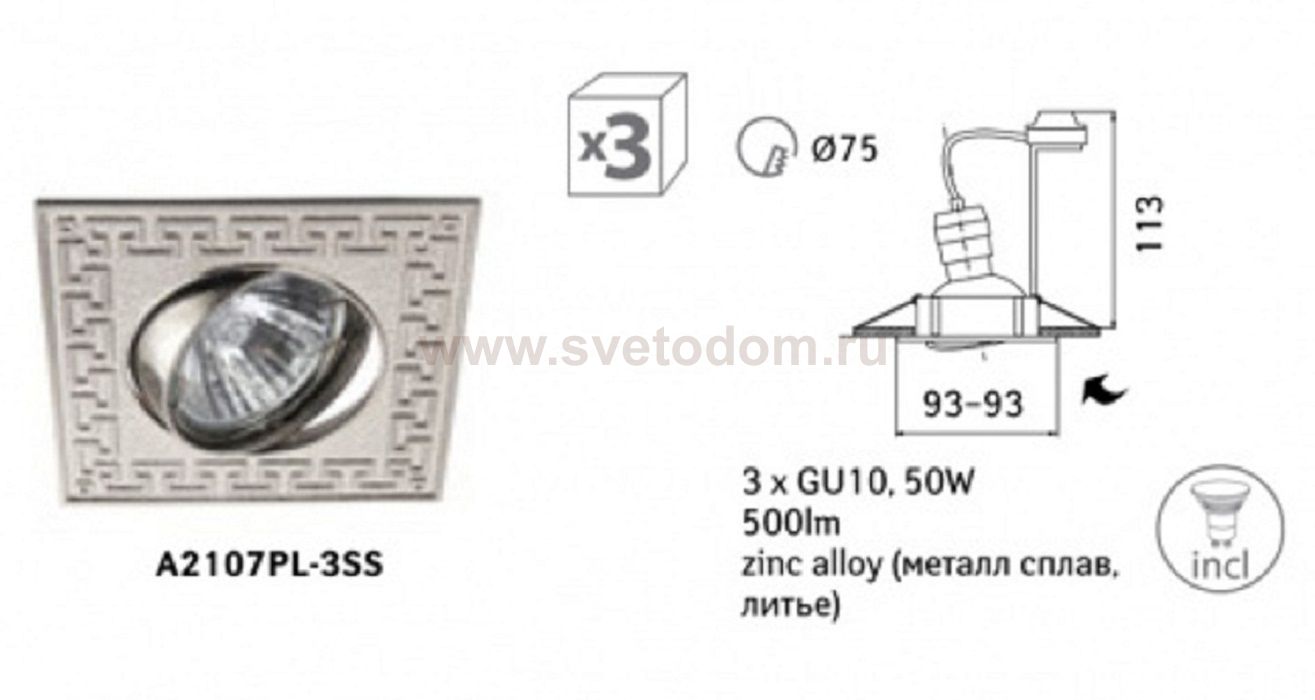 Встраиваемые светильники – популярное осветительное оборудование, которое можно использовать в качестве основного источника или в дополнение к люстре. Они позволяют создать нужную атмосферу атмосферу и привнести в интерьер уют и комфорт. Интернет-магазин «Светодом» предлагает стильный встраиваемый светильник ARTE Lamp A2107PL-3SS. Данная модель достаточно универсальна, поэтому подойдет практически под любой интерьер. Перед покупкой не забудьте ознакомиться с техническими параметрами, чтобы узнать тип цоколя, площадь освещения и другие важные характеристики. Приобрести встраиваемый светильник ARTE Lamp A2107PL-3SS в нашем онлайн-магазине Вы можете либо с помощью «Корзины», либо по контактным номерам. Мы развозим заказы по Москве, Екатеринбургу и остальным российским городам.