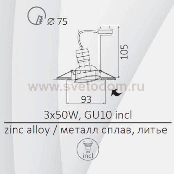 Данный размер указывает какое отверстие необходимо сделать для правильного монтажа. Зачастую светильники выбирают после ремонта и сделанных монтажных отверстий, тогда подбор осуществляется строго в размер +/- 2-5мм.