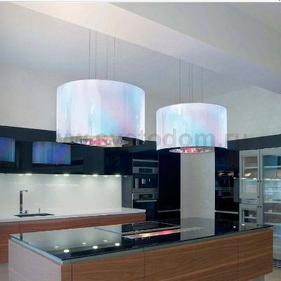 Подвесной светильник. 3 источника освещения : вверх - галогенная лампа, управляемая пультом ДУ, вниз 3х150вт , диммируемые( каждая в отдельности) и управляемые с ПУ с цветными фильтрами, по периметру - люминесцентные RGB, управляемые с ПУ. Свнетильник способен работать в автоматическом режиме, периметр меняет 7 заданных цветов. возможна установка дополнительных цветов по Вашему желанию. Пульт управления идет в комплекте |