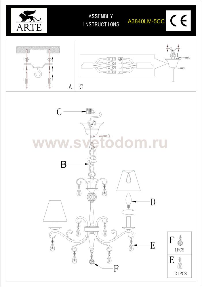 Дополнительно рекомендуем посмотреть другие хрустальные люстры и светильники из данной серии. Модель - люстры Arte Lamp A3840LM-5CC замечательно впишется в задуманный Вами интерьер зала, гостиной или спальни. Купите хрустальную люстру уже сегодня и Вы поймете превосходство светильников перед другими направлениями освещения. Основное превосходство хрусталя - это отражение и преломление света во всем пространстве, а отсутствие абажуров не съест получаемый световой поток от горящих ламп!