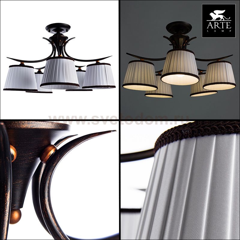 Потолочный светильник Arte lamp A5133РL-5BR – отличное решение для комнаты площадью до 14 кв.м. с невысоким потолком! Конструкция выполнена таким образом, что все пять источников света размещены на ней без дополнительных, «утяжеляющих» деталей и ненужных элементов декора, благодаря чему светильник выглядит легким, «воздушным» и зрительно увеличивает высоту помещения. Гармоничное, приятное для глаз сочетание коричневого и белого тонов, трапециевидные тканевые плафоны, делают люстру «уютной» и стильной. В комплекте с несколькими бра из этой же серии светильник создаст в комнате полную спокойствия и положительной энергетики атмосферу, и придаст интерьеру законченный и совершенный вид.