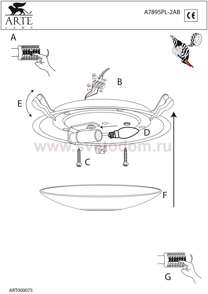 Настенно потолочный светильник ARTE Lamp (арте ламп) A7895PL-2AB подходит как для установки в вертикальном положении - на стены, так и для установки в горизонтальном - на потолок. Для установки настенно потолочных светильников на натяжной потолок необходимо использовать светодиодные лампы LED, которые экономнее ламп Ильича (накаливания) в 10 раз, выделяют мало тепла и не дадут расплавиться Вашему потолку.