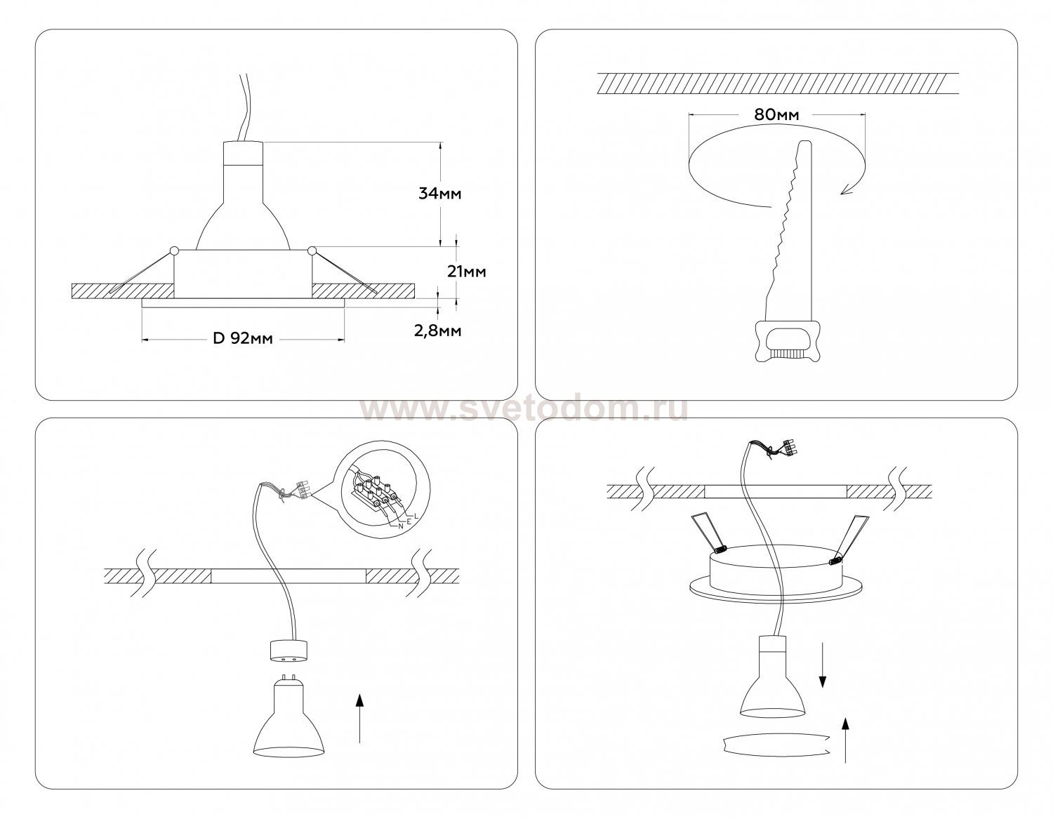 Данный размер указывает какое отверстие необходимо сделать для правильного монтажа. Зачастую светильники выбирают после ремонта и сделанных монтажных отверстий, тогда подбор осуществляется строго в размер +/- 2-5мм.