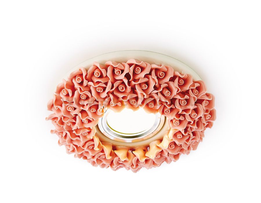 Встраиваемый точечный светильник серии ORGANIC SPOT. Модель D5505PI выполнена в современном стиле Фьюжн, формы полусфера. Изготовлен из керамики розового цвета с превосходным цветочным орнаментом, и металлического корпуса. Эти модели будут украшением для любого помещения. Для светильников этой коллекции подойдут лампы типа MR16.
