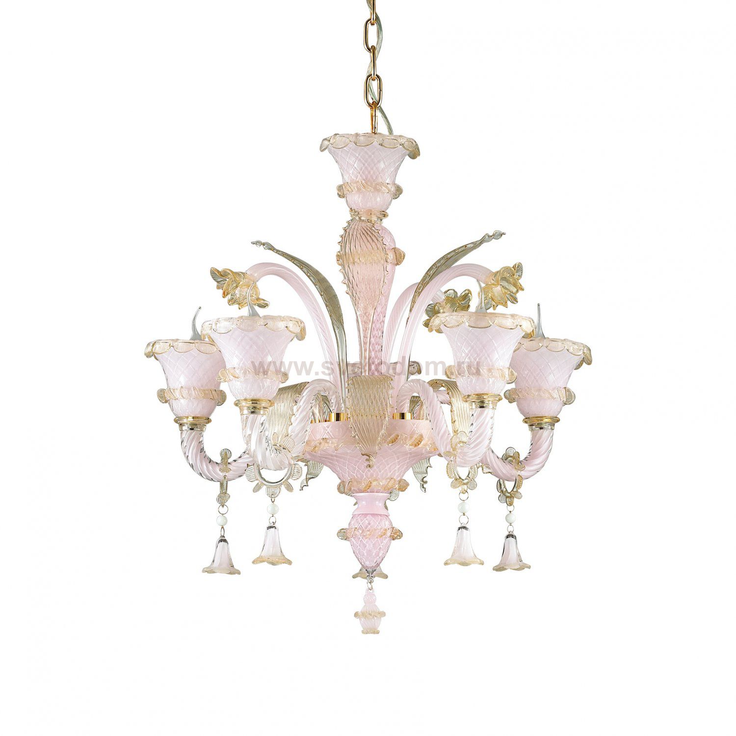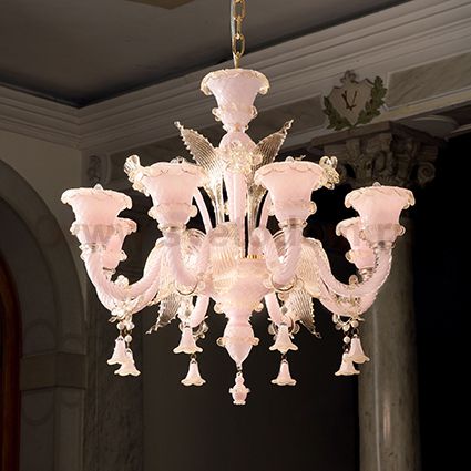 Люстра из дутого стекла ручной работы, украшена янтарной стеклянной пастой или розовой. Металические детали латуневого цвета.