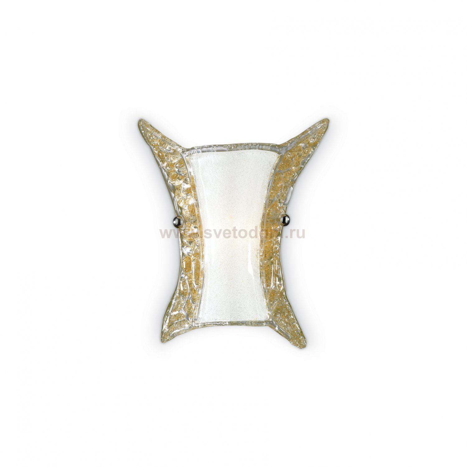 Светильник бра от известной итальянской фабрики Ideal lux из каталога Classico в венецианском стиле под артикулом APE AP1 SMALL (2897) серии APE имеет ряд отличительных характеристик: Рассеватель из прозрачного стекла сделанного на раскалённом листе с белыми песчинками в центральной части и янтарными по бокам. Закрепляющие плафон винты хромированного цвета.
